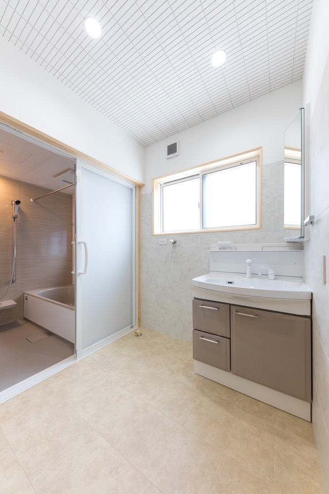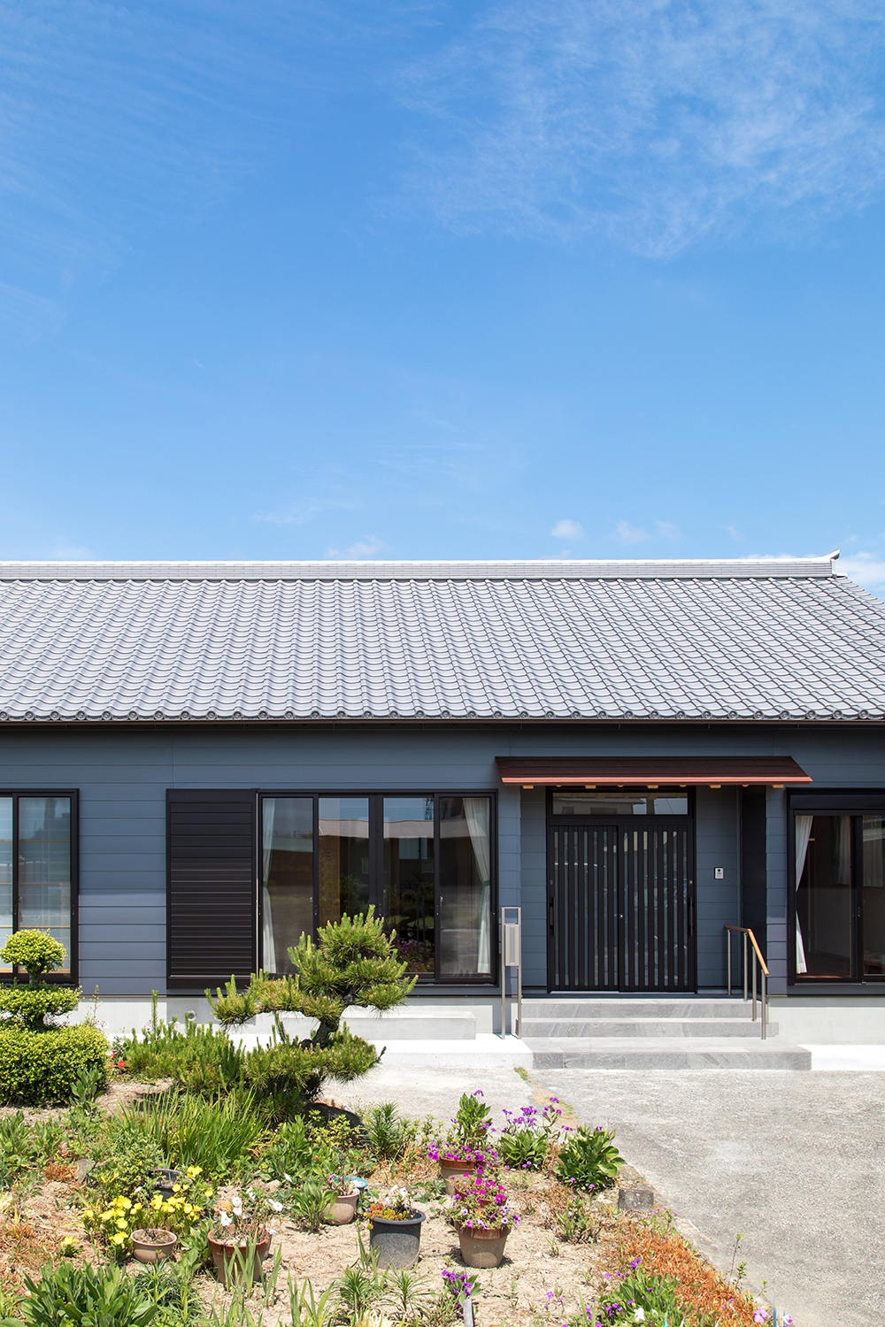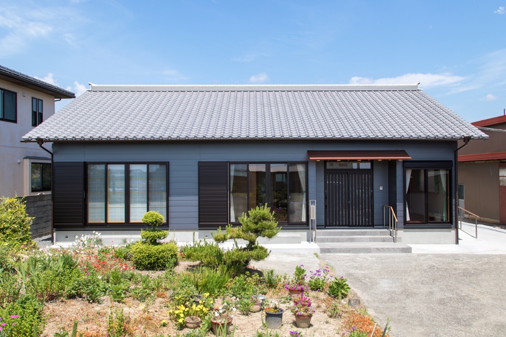 瓦屋根の眩しい平屋の家。