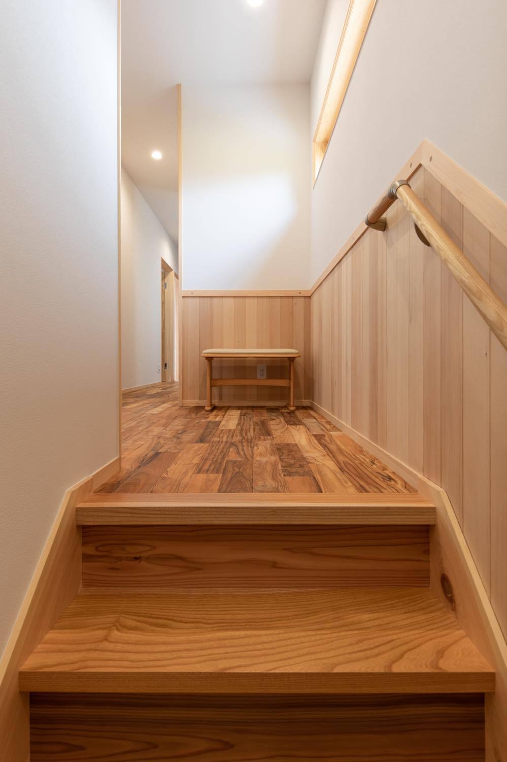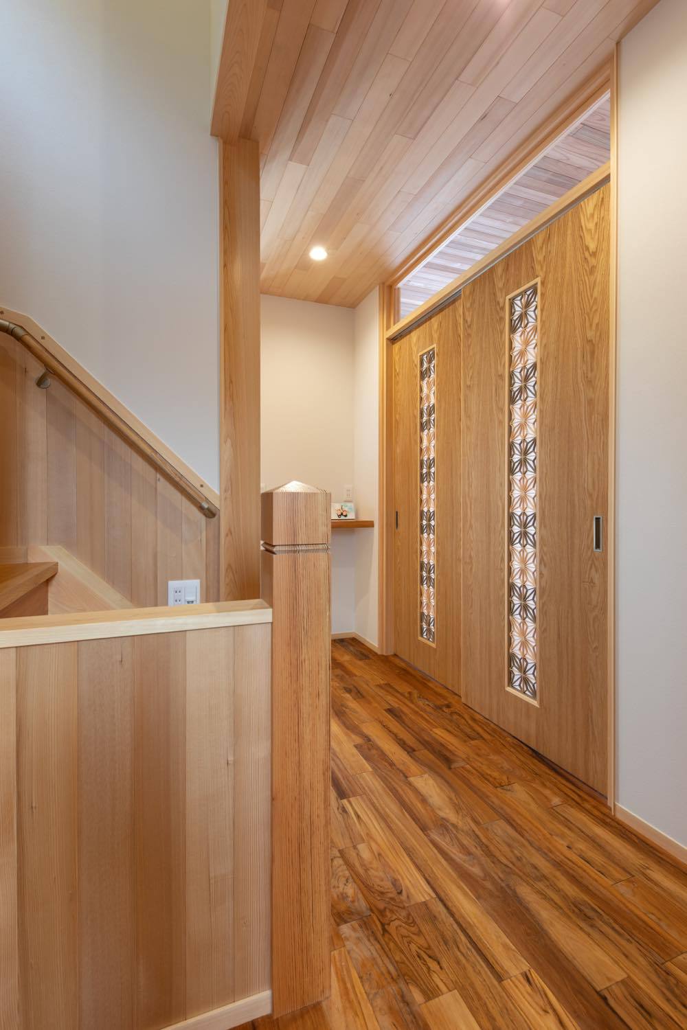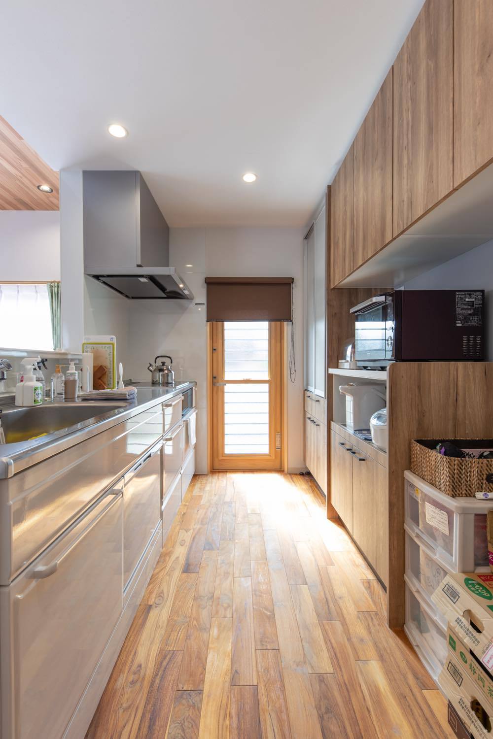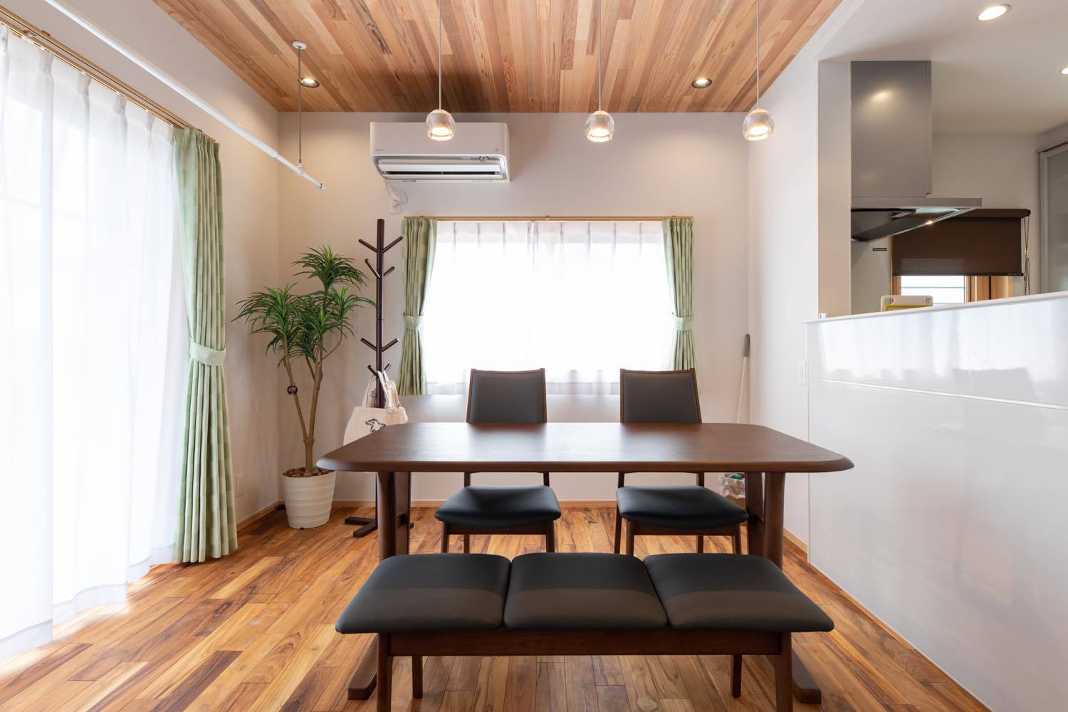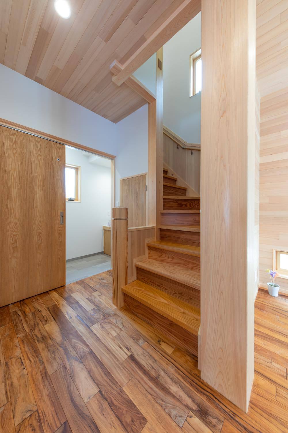 奥さまの父親が大工ということもあり、かねてから「上質な木の家」を望んでいたというIさんご夫妻。奥さまがネットを駆使し、掲示板で運よく『櫻 工務店』の建主OBと出会えたことがアプローチのきっかけになりました。「ゆとりのある玄関」「広いLDK」といった要望が盛り込まれ、できあがったのは、チークの床にスギ板の天井など自然素材に満ちた心地よい家。家族がくつろぐLDKはひとつながりで、20畳という大空間を確保しています。暮らしやすさのポイントは、キッチンから洗面脱衣室、リビングまでコンパクトに動ける回遊動線と、各所に設けた豊富な収納。無垢材の調湿効果で快適に過ごせる上に、端正な木の空間をストレスなくすっきりと保てる理想の住まいが実現しました。