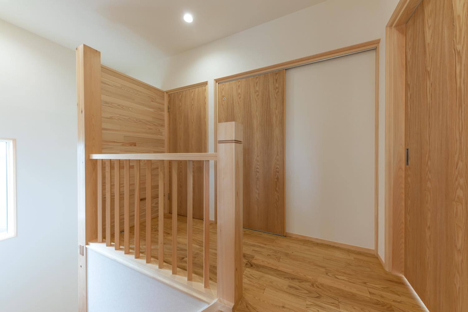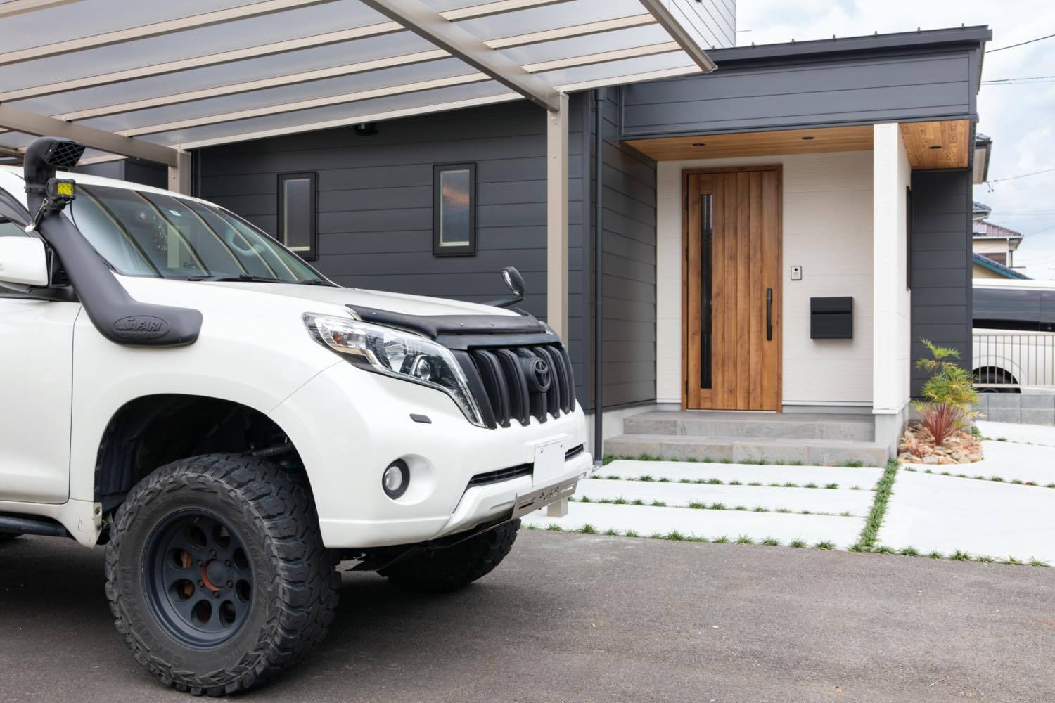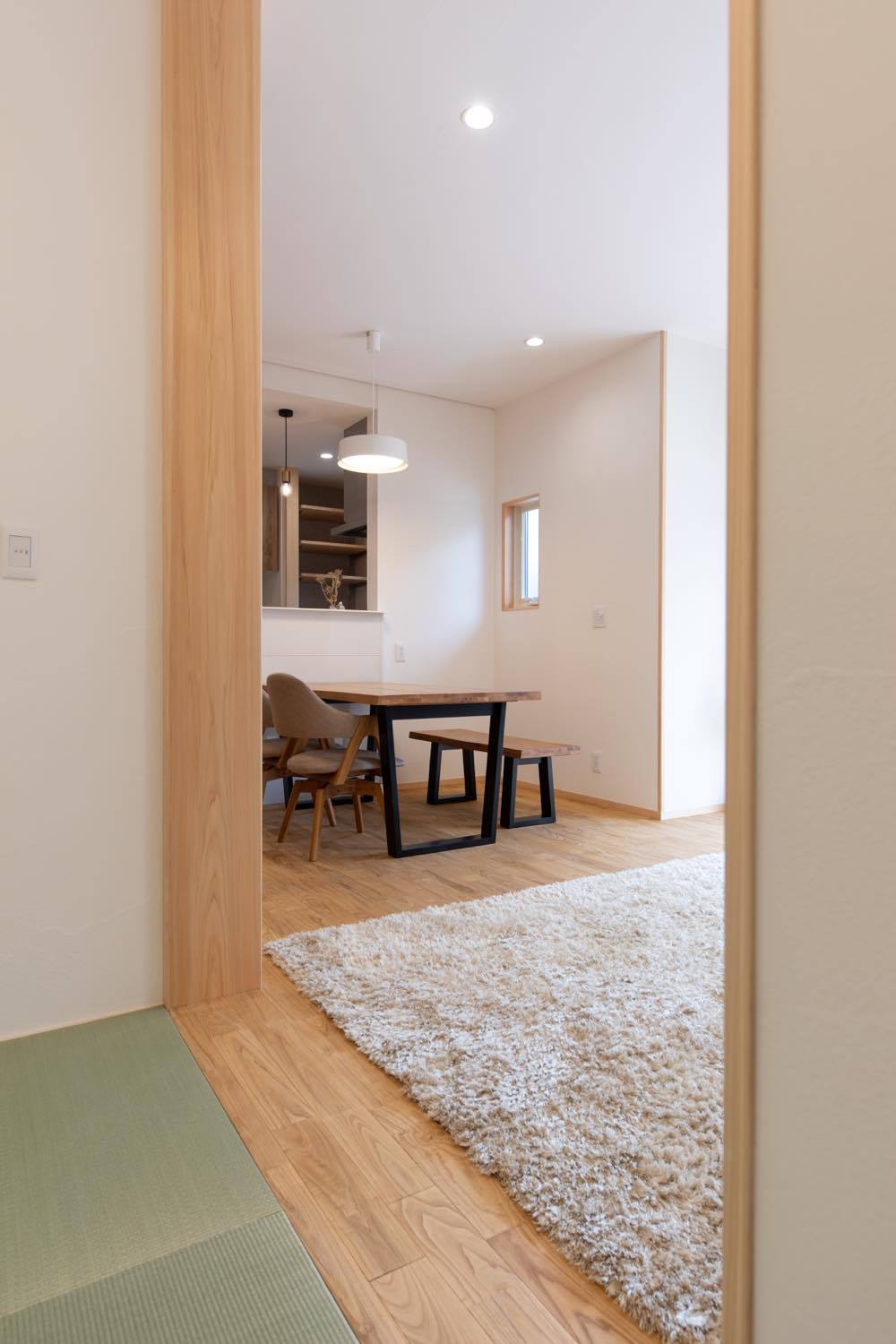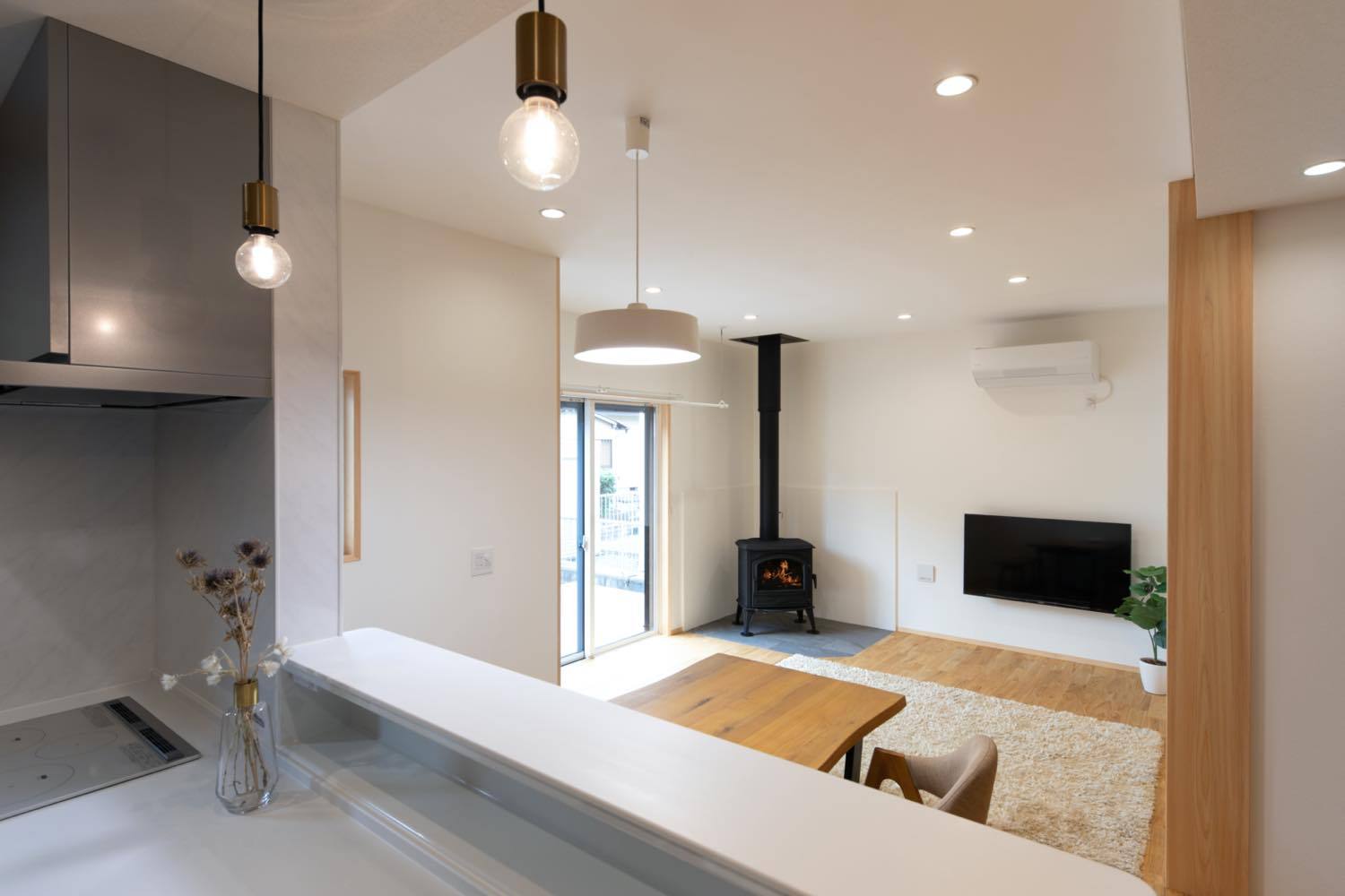 薪ストーブの炎を眺めながら過ごす―。Sさんご夫妻は、こうした暮らしに憧れ、櫻 工務店に夢を託したそうです。薪ストーブは、アウトドア好きのご主人がオーダーしたもの。1階に水回りなどの機能を集中させた無駄のないプランには、「来客と家族用を分けた広い玄関」「パントリー棚付き対面キッチン」「リビングとつながった畳スペース」と、暮らしやすい工夫がちりばめられています。統一感のあるインテリアは、奥さまが「飽きのこないデザイン」を目指し、インスタグラムを参考に壁紙などを吟味。OBさん宅で出合ったクリの床板をベースとし、リビングはコテ跡が残った漆喰の塗り壁に。素材の質感がくつろぎをもたらす、現代の暮らしにフィットする木の家を叶えています。