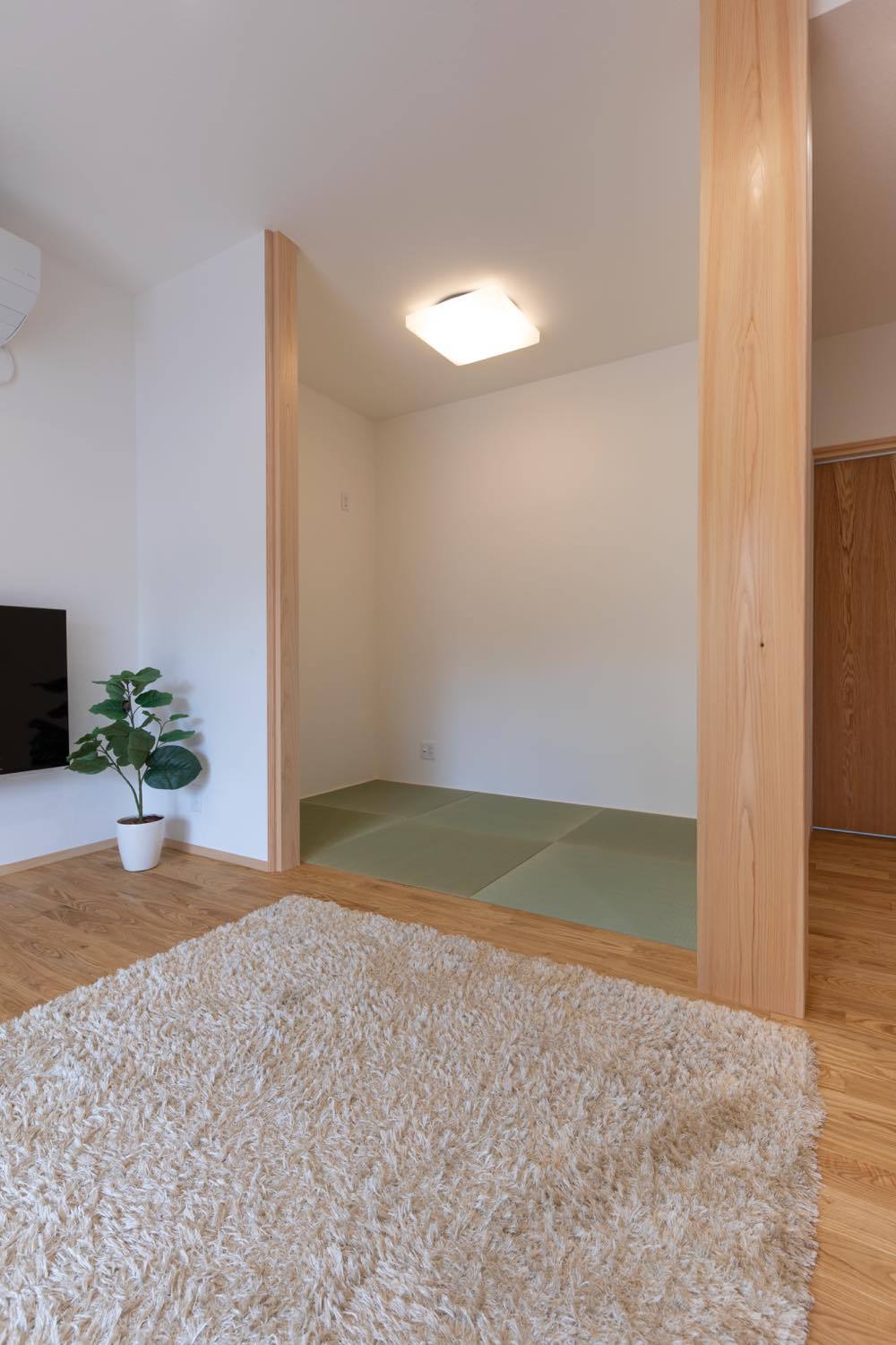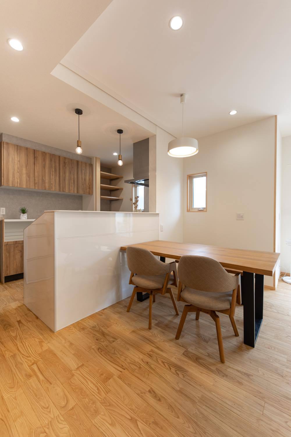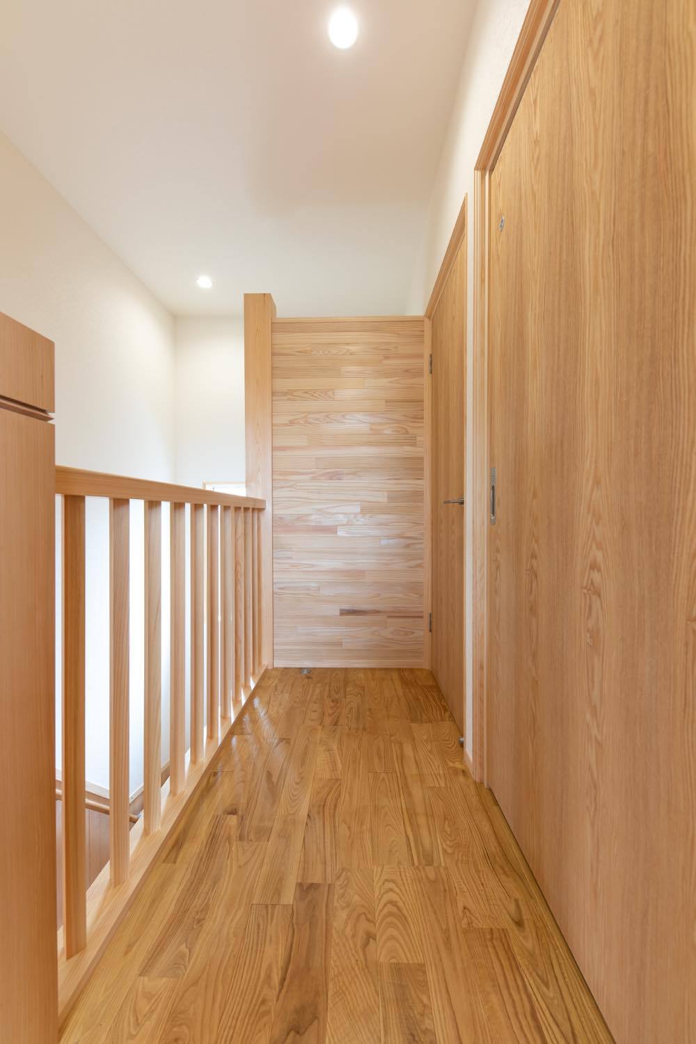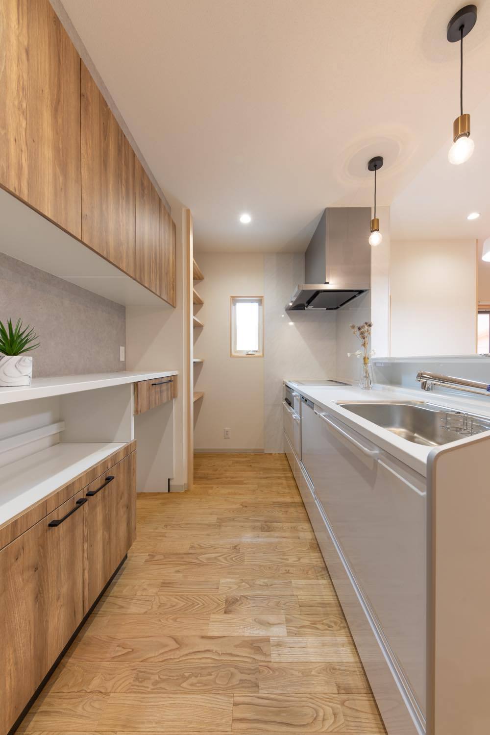 薪ストーブの炎を眺めながら過ごす―。Sさんご夫妻は、こうした暮らしに憧れ、櫻 工務店に夢を託したそうです。薪ストーブは、アウトドア好きのご主人がオーダーしたもの。1階に水回りなどの機能を集中させた無駄のないプランには、「来客と家族用を分けた広い玄関」「パントリー棚付き対面キッチン」「リビングとつながった畳スペース」と、暮らしやすい工夫がちりばめられています。統一感のあるインテリアは、奥さまが「飽きのこないデザイン」を目指し、インスタグラムを参考に壁紙などを吟味。OBさん宅で出合ったクリの床板をベースとし、リビングはコテ跡が残った漆喰の塗り壁に。素材の質感がくつろぎをもたらす、現代の暮らしにフィットする木の家を叶えています。
