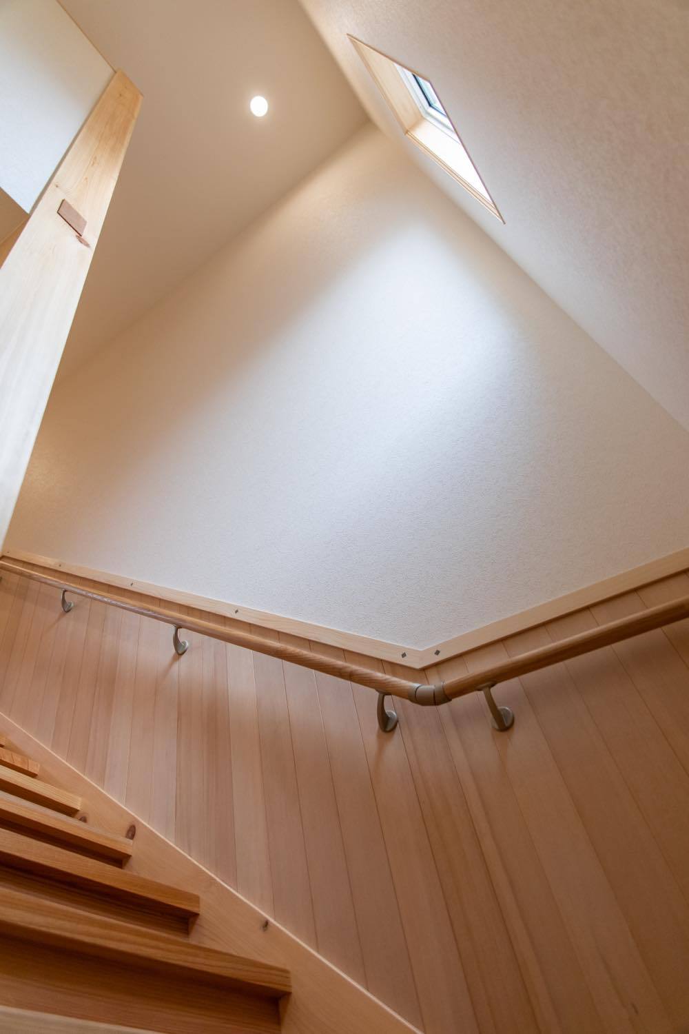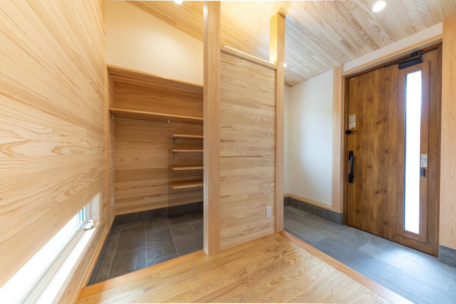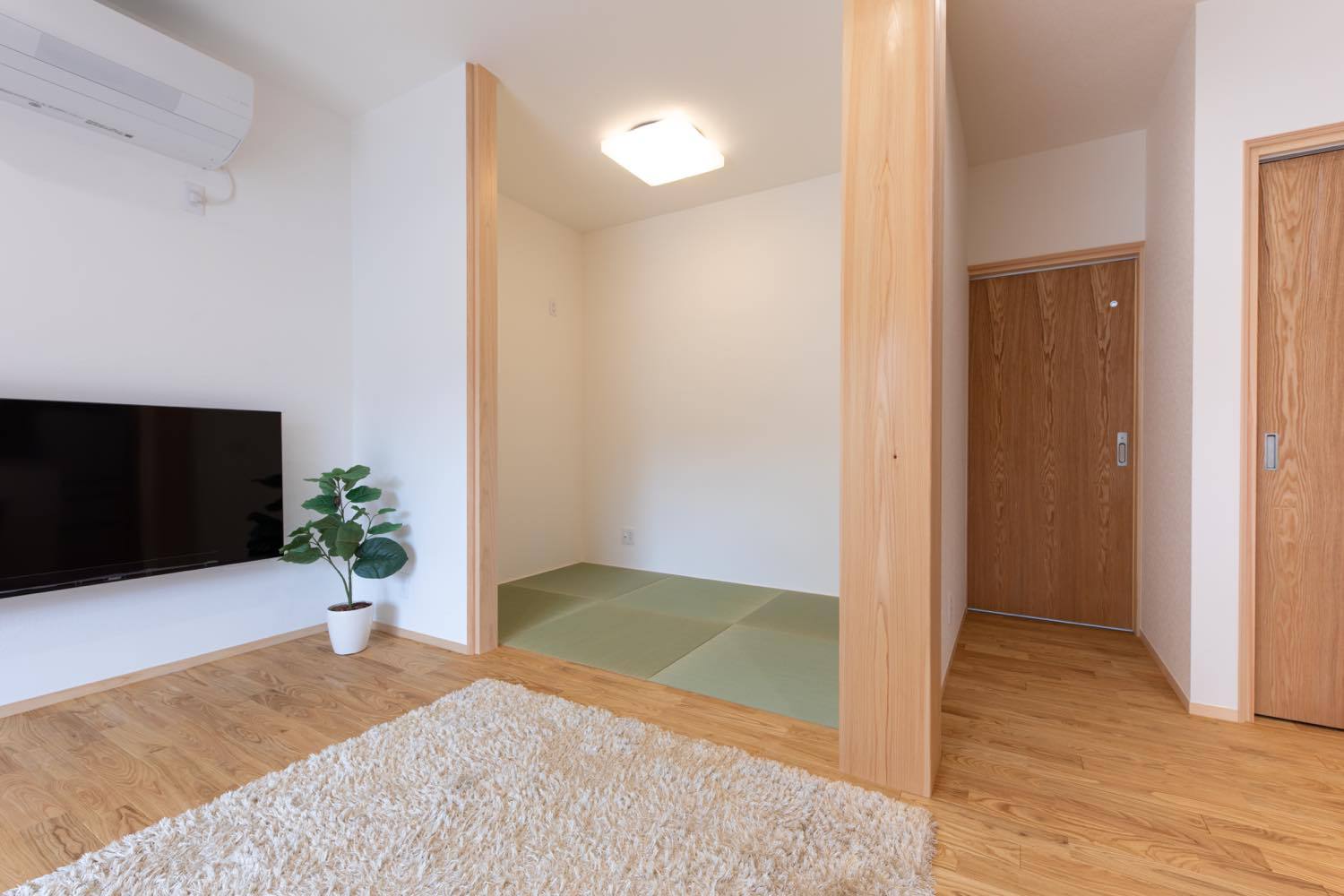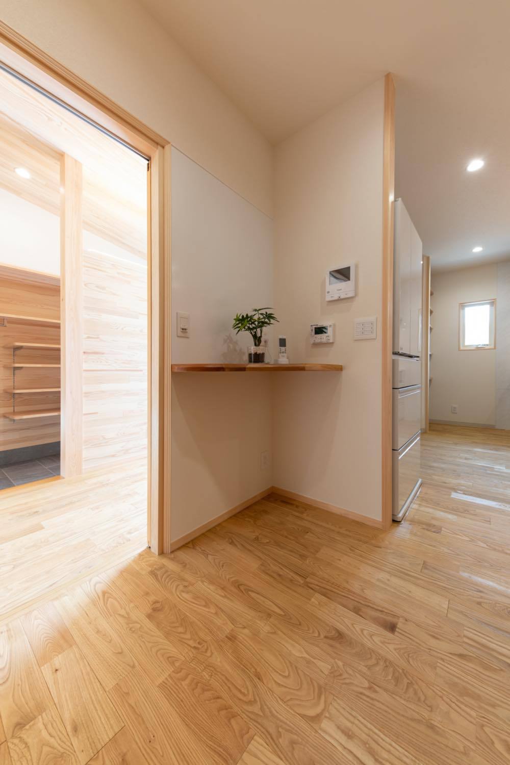 薪ストーブの炎を眺めながら過ごす―。Sさんご夫妻は、こうした暮らしに憧れ、櫻 工務店に夢を託したそうです。薪ストーブは、アウトドア好きのご主人がオーダーしたもの。1階に水回りなどの機能を集中させた無駄のないプランには、「来客と家族用を分けた広い玄関」「パントリー棚付き対面キッチン」「リビングとつながった畳スペース」と、暮らしやすい工夫がちりばめられています。統一感のあるインテリアは、奥さまが「飽きのこないデザイン」を目指し、インスタグラムを参考に壁紙などを吟味。OBさん宅で出合ったクリの床板をベースとし、リビングはコテ跡が残った漆喰の塗り壁に。素材の質感がくつろぎをもたらす、現代の暮らしにフィットする木の家を叶えています。