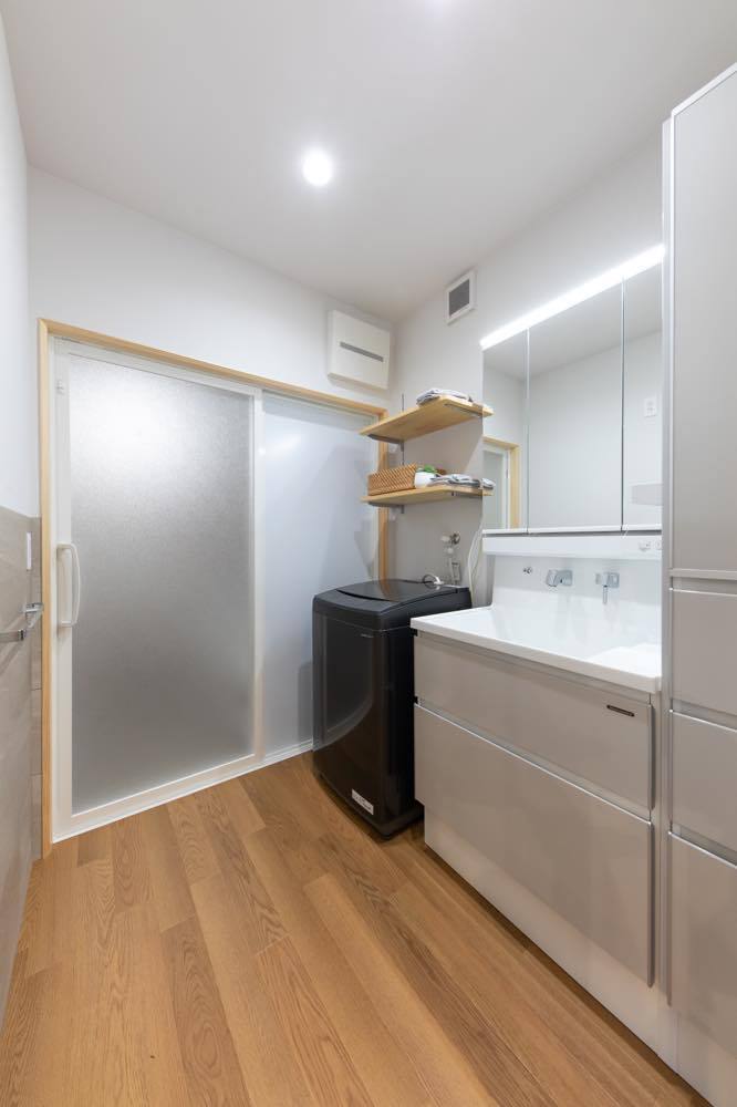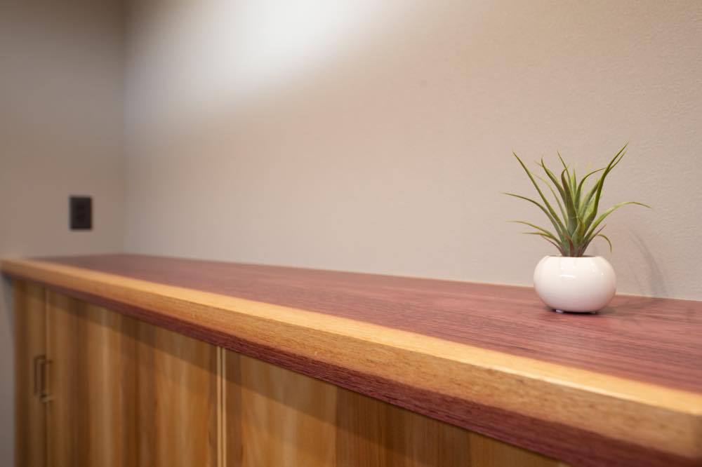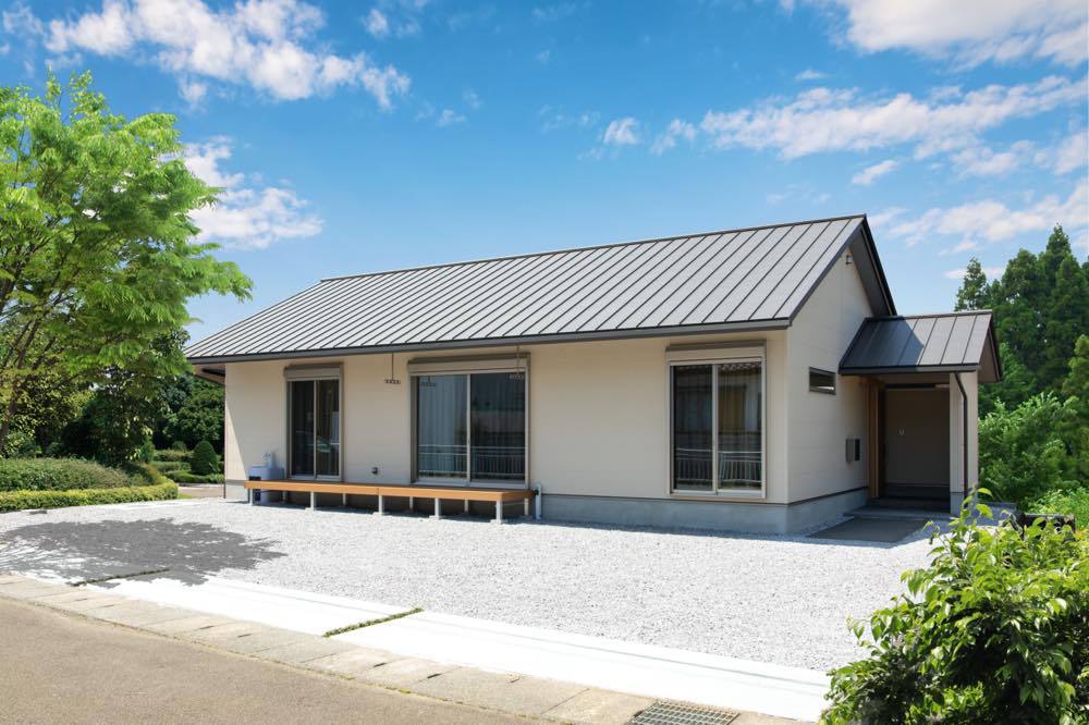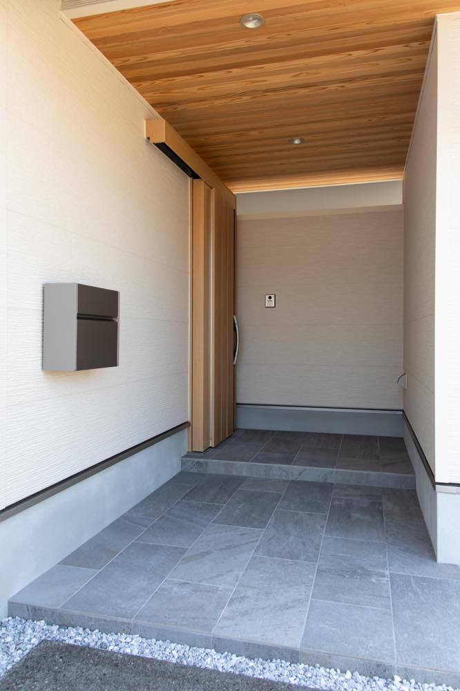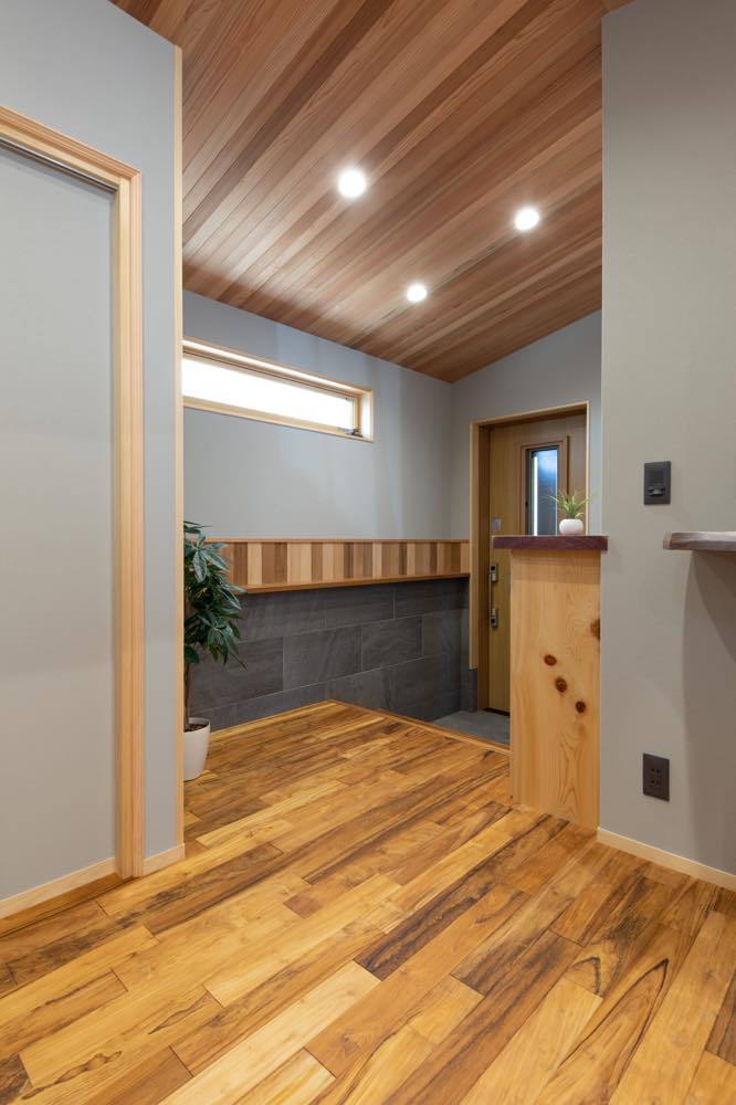 子どもが巣立ったのを機に、夫婦2人の終の住処の準備をしようと思い立ったAさん夫妻。最初は吹き抜けのある2階建を希望していましたが、必要な部屋数や将来の生活しやすさを考えて、櫻井社長が平屋を提案。屋根の傾斜を大きくして室内にも反映させたリビングは、高さのある勾配天井が開放感を感じさせます。キッチンとリビングを仕切る下がり壁には間接照明を入れ、壁の一面をタイル風のアクセントウォールに。木の自然なぬくもりを活かした洋風テイストのデザインに仕上がっています。小屋根付きの玄関ポーチは雨よけだけでなく周囲からの視線を遮る造りで、自転車置き場も設置。造作した靴箱の上にはパープルがかった貴重な無垢の一枚板を使い、既製品にはないオリジナルな仕様が目を引きます。