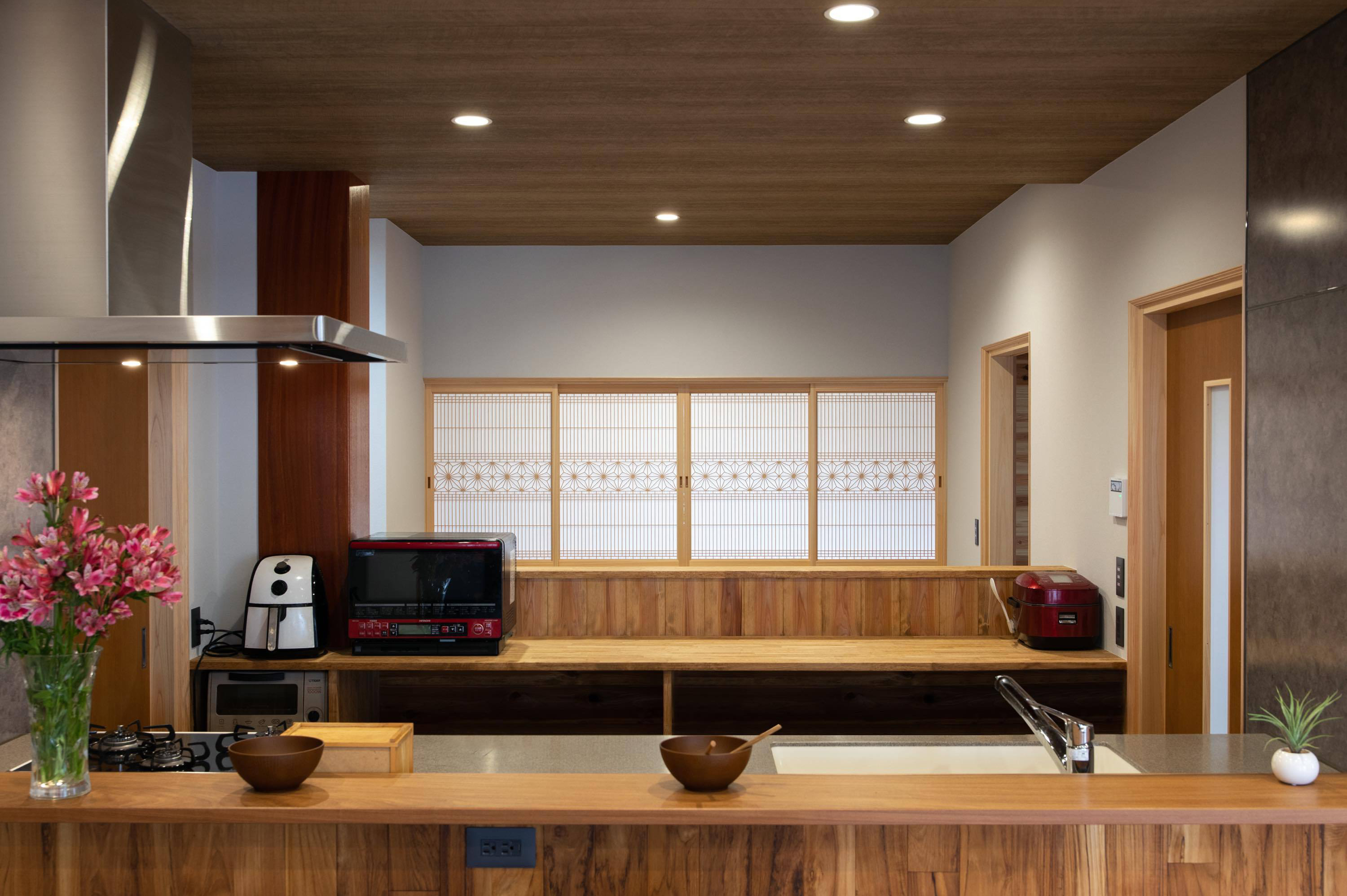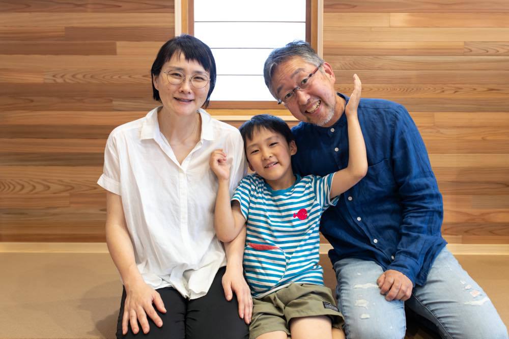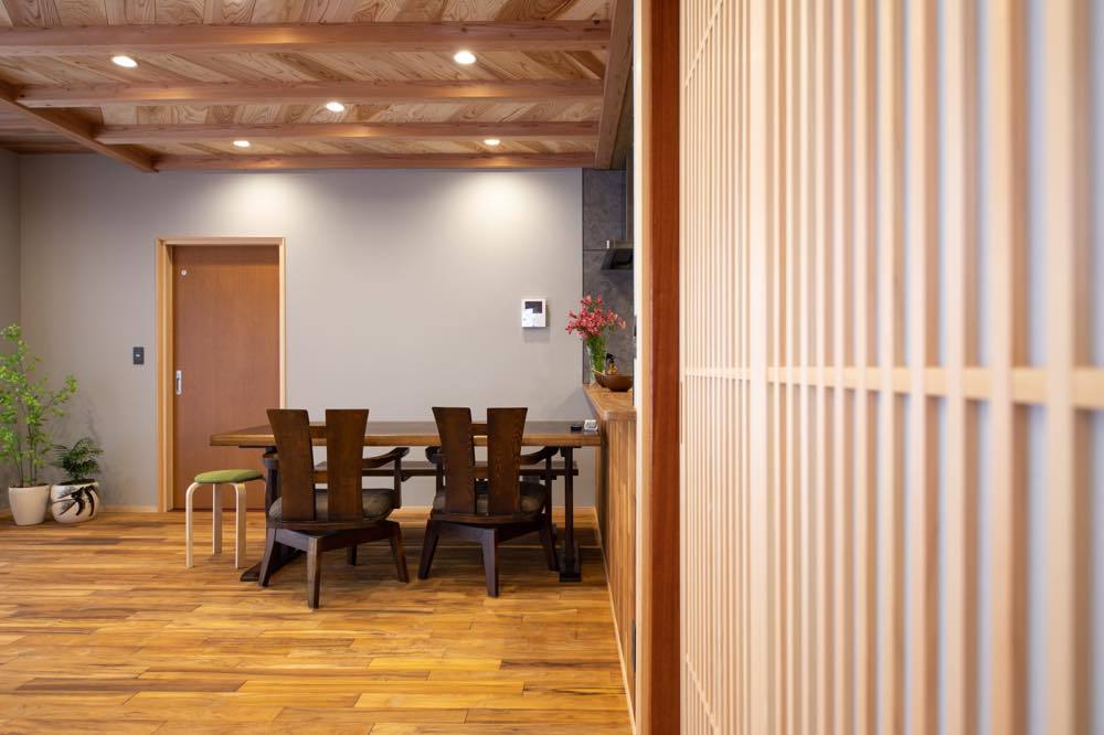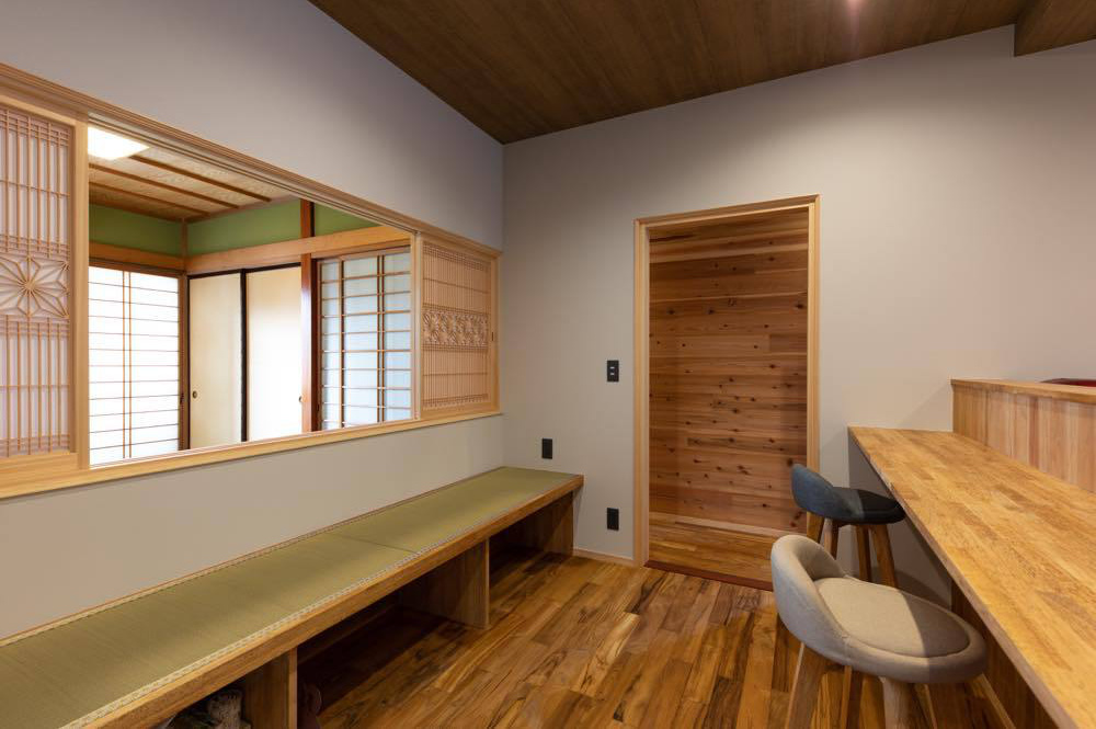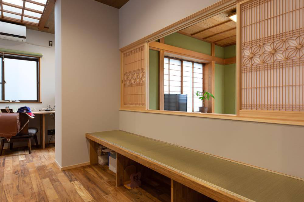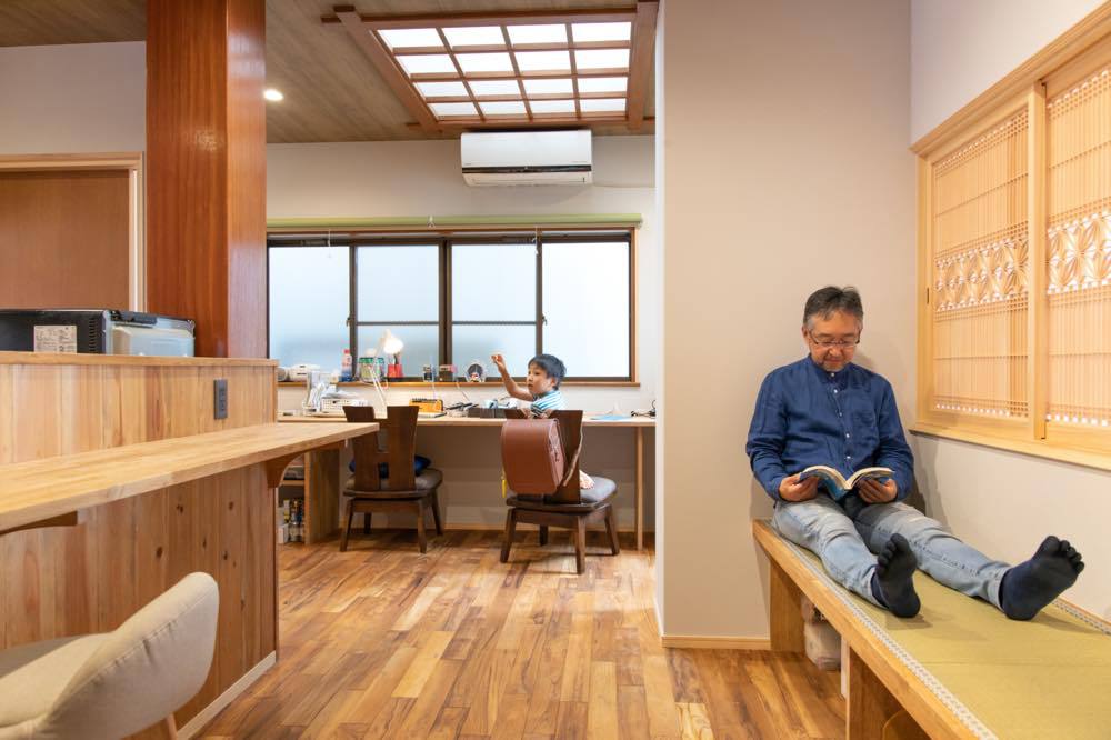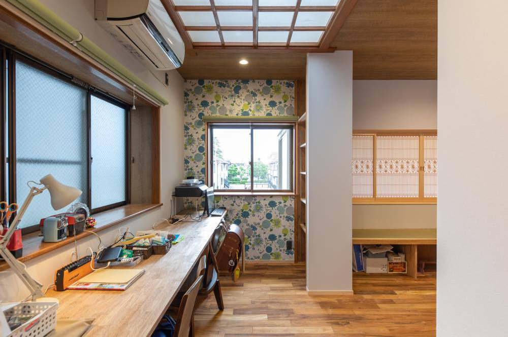 区画整理で25年前に建て替え。その後で南側に3階建ての家が建ち日当たりが悪くなってしまったことと家族構成の変化もあって、リフォームを決断しました。1階にあったキッチンをなくし、リビング・和室とつなげて生まれた15畳の和室は、ご主人が開く運動教室の会場に。浴室は生徒さんの靴箱も備えた玄関に変わりました。店舗と住居が接する廊下の突き当たりには、階段下を活用した書斎コーナーを新設。壁紙を変えて一新した階段を上がると、オープンキッチンを中心に回遊できる、明るく風通しのよい空間が広がります。続きの仏間は和紙畳のリビングと板張りのダイニングに変身。障子窓はそのまま活かし、壁の曲線や矢羽根天井で和洋折衷の仕上がりに。家事室とスタディコーナーは北欧風とデザインにもこだわりました。