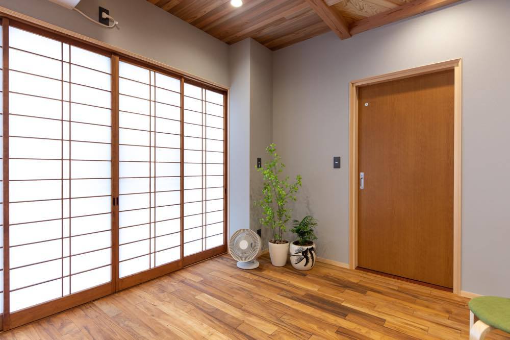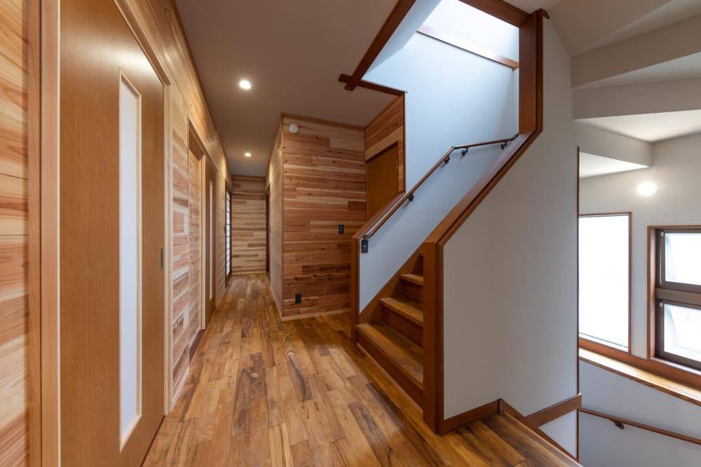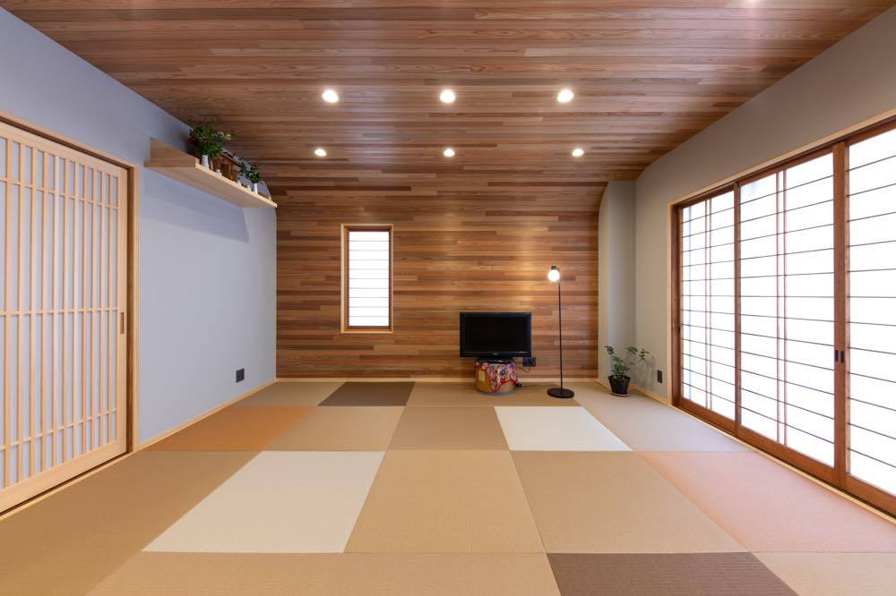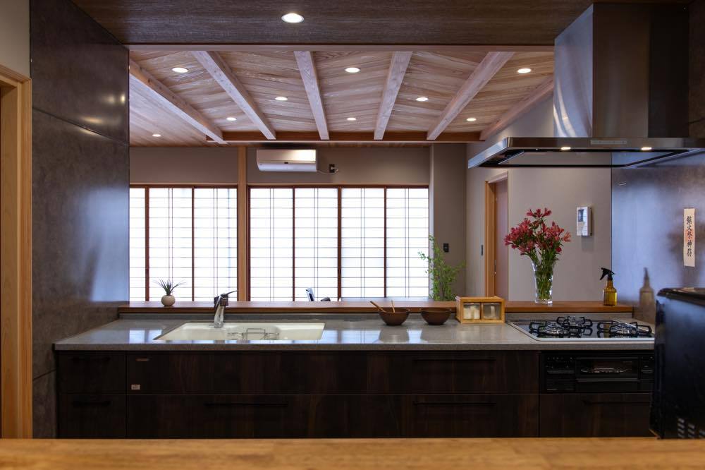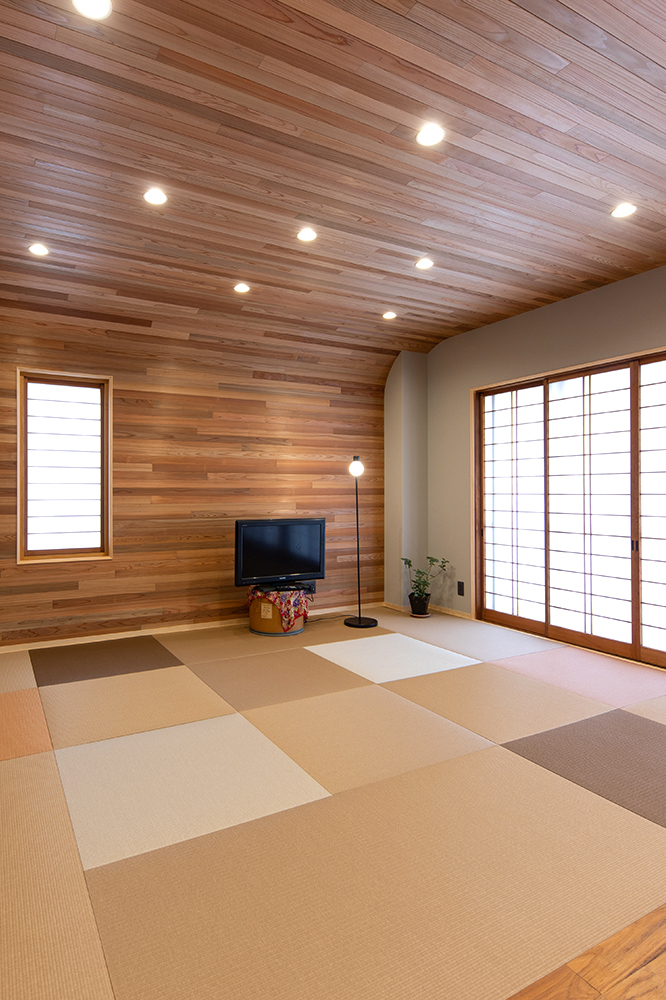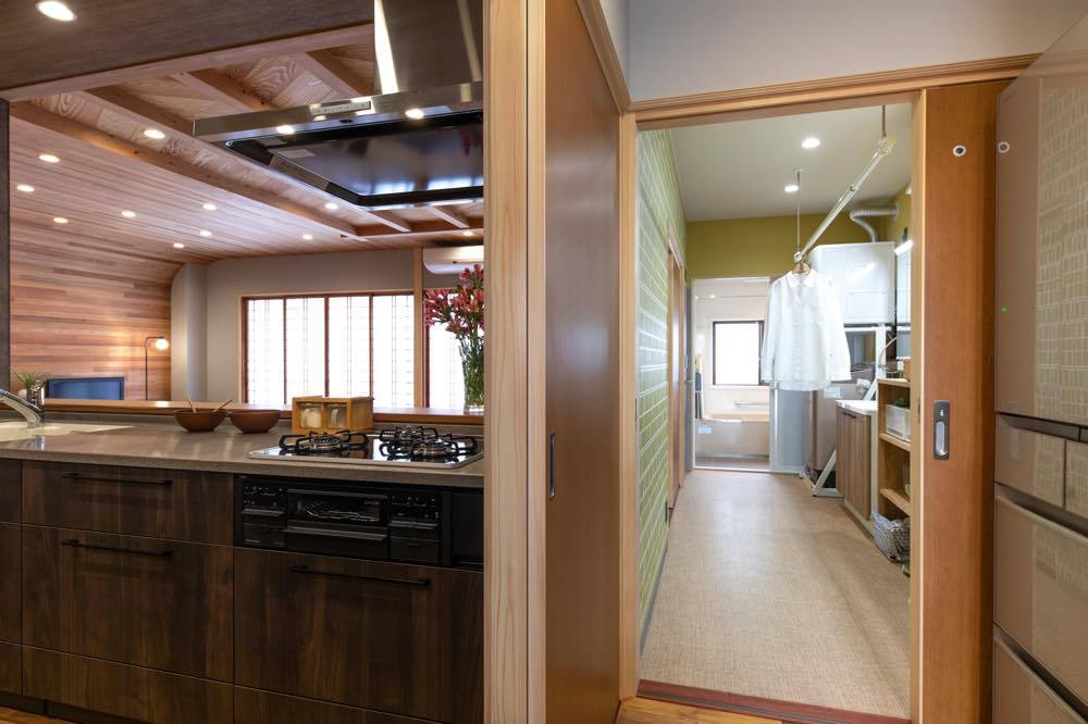 区画整理で25年前に建て替え。その後で南側に3階建ての家が建ち日当たりが悪くなってしまったことと家族構成の変化もあって、リフォームを決断しました。1階にあったキッチンをなくし、リビング・和室とつなげて生まれた15畳の和室は、ご主人が開く運動教室の会場に。浴室は生徒さんの靴箱も備えた玄関に変わりました。店舗と住居が接する廊下の突き当たりには、階段下を活用した書斎コーナーを新設。壁紙を変えて一新した階段を上がると、オープンキッチンを中心に回遊できる、明るく風通しのよい空間が広がります。続きの仏間は和紙畳のリビングと板張りのダイニングに変身。障子窓はそのまま活かし、壁の曲線や矢羽根天井で和洋折衷の仕上がりに。家事室とスタディコーナーは北欧風とデザインにもこだわりました。