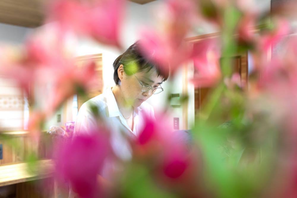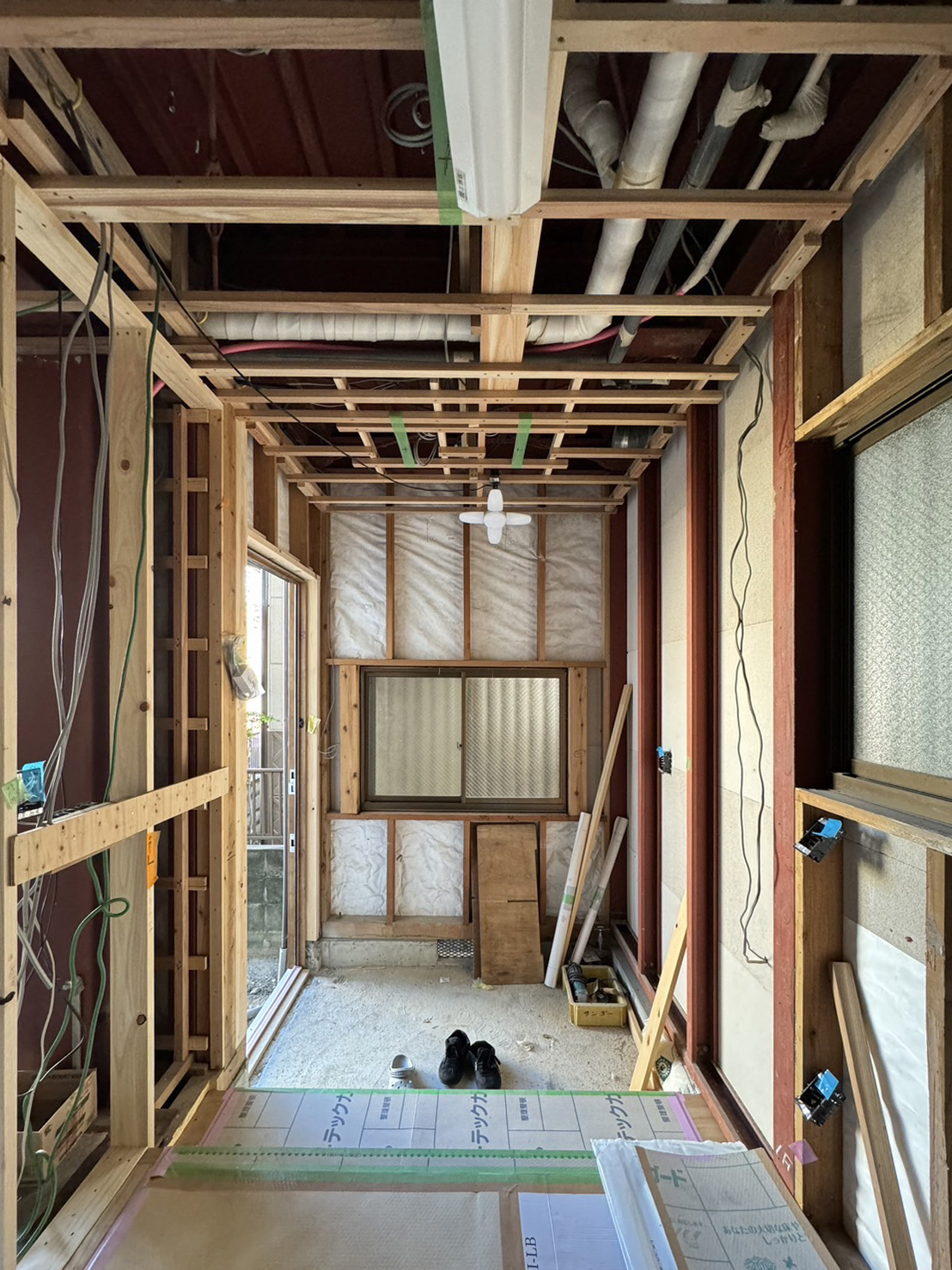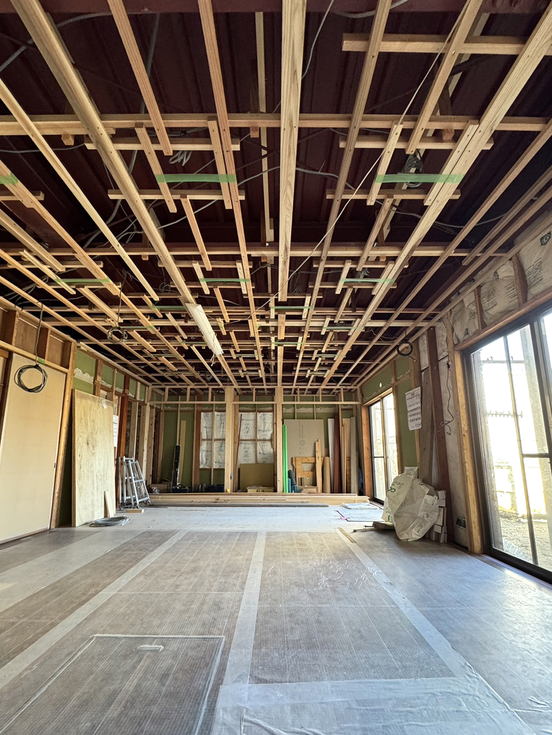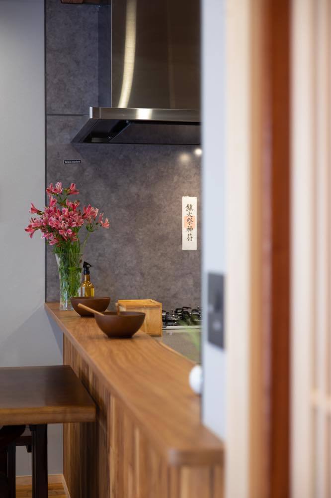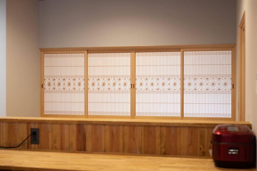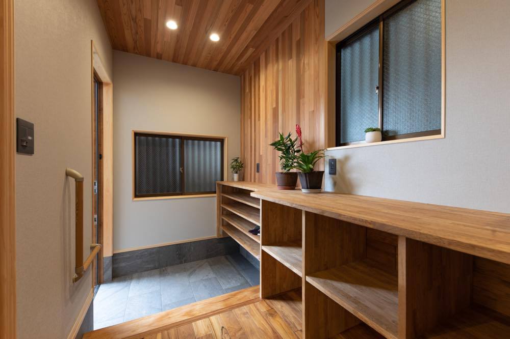 区画整理で25年前に建て替え。その後で南側に3階建ての家が建ち日当たりが悪くなってしまったことと家族構成の変化もあって、リフォームを決断しました。1階にあったキッチンをなくし、リビング・和室とつなげて生まれた15畳の和室は、ご主人が開く運動教室の会場に。浴室は生徒さんの靴箱も備えた玄関に変わりました。店舗と住居が接する廊下の突き当たりには、階段下を活用した書斎コーナーを新設。壁紙を変えて一新した階段を上がると、オープンキッチンを中心に回遊できる、明るく風通しのよい空間が広がります。続きの仏間は和紙畳のリビングと板張りのダイニングに変身。障子窓はそのまま活かし、壁の曲線や矢羽根天井で和洋折衷の仕上がりに。家事室とスタディコーナーは北欧風とデザインにもこだわりました。