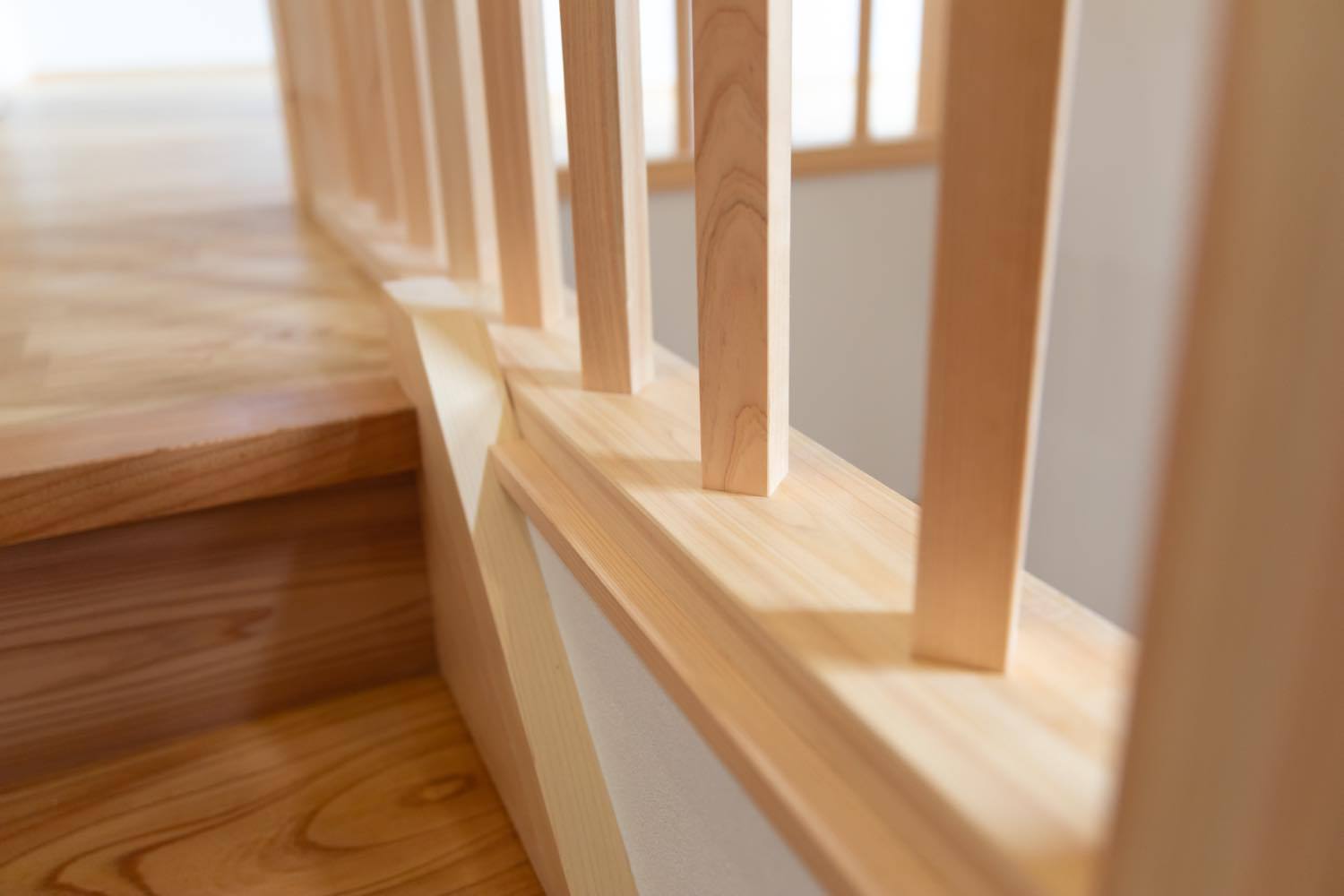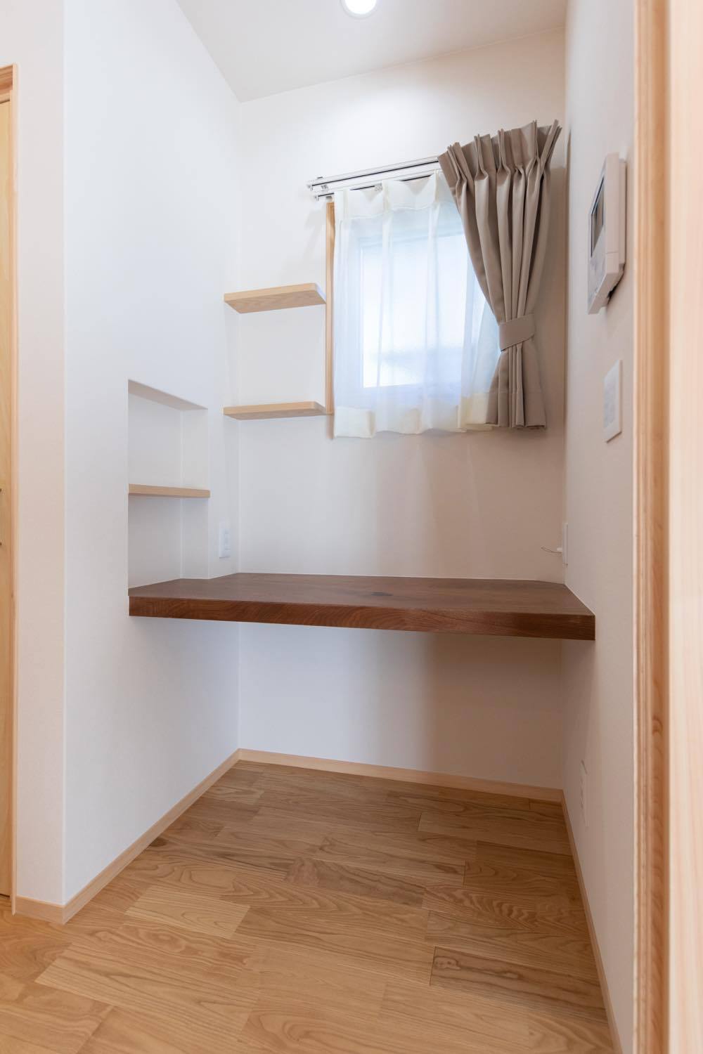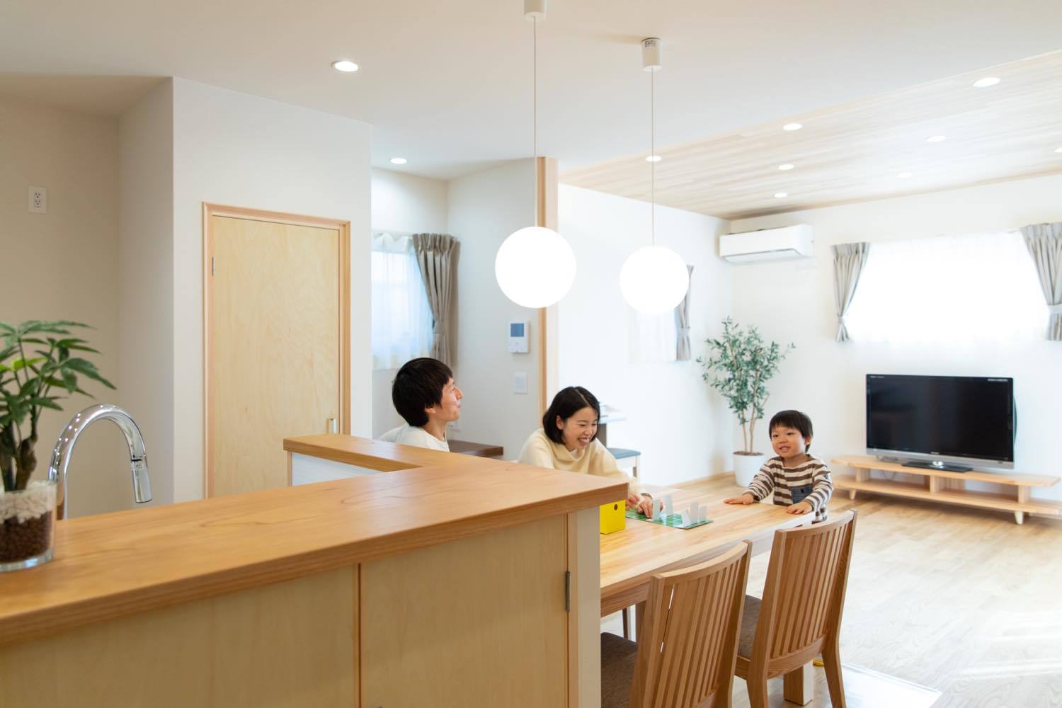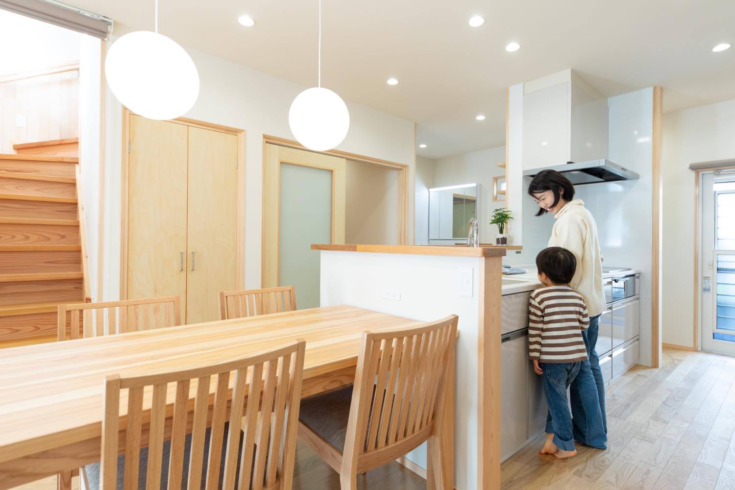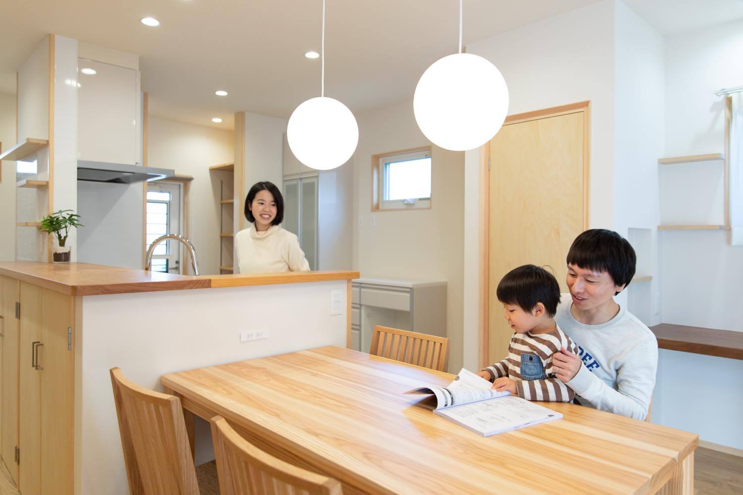 玄関では木の形を活かしたケヤキの上がり框がお出迎え。クリ無垢床の廊下を歩いて奥に進むと、白を基調に明るい色の木を合わせたLDKが広がります。奥さまのたっての希望でダイニングと横並びにしたキッチンは、ぐるりと回れるアイランド型。洗面脱衣室もLDKと廊下の2方向から出入りできる動線を確保しました。2階ホールに造作したブラックウォールナットのカウンターは「部屋以外にも家族の居場所を作りたくて」というご主人の要望を叶えたスペースです。階段や収納はもちろん巾木、窓枠、ドア枠まで木で造られ、大工を生業とするご主人のお父さまも「いい仕事をしている」と太鼓判を押す仕上がり。木の香りに包まれた新居で、Oさん家族の新しい暮らしが始まります。