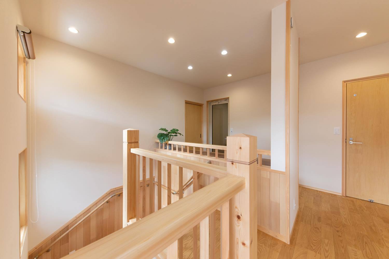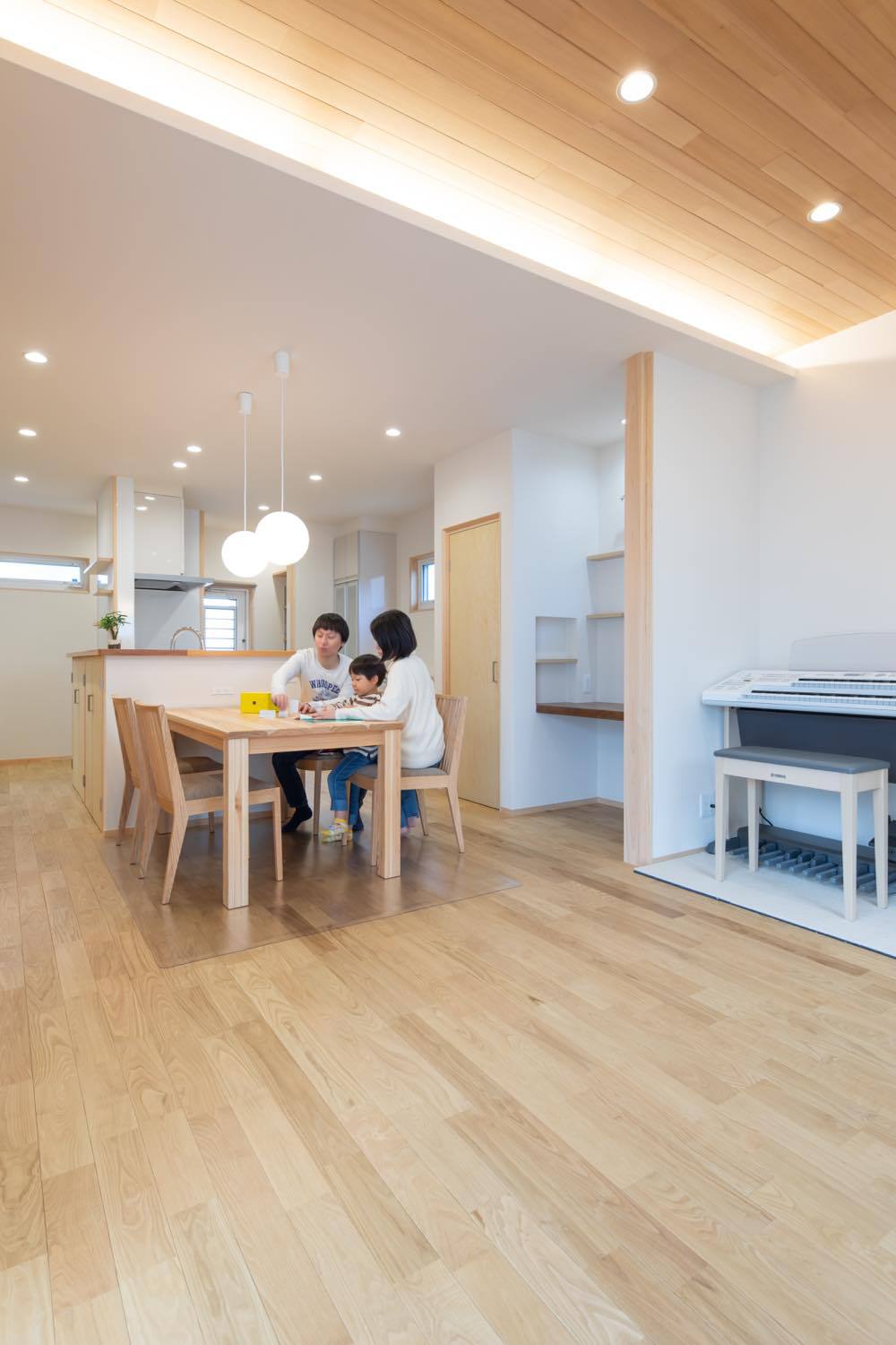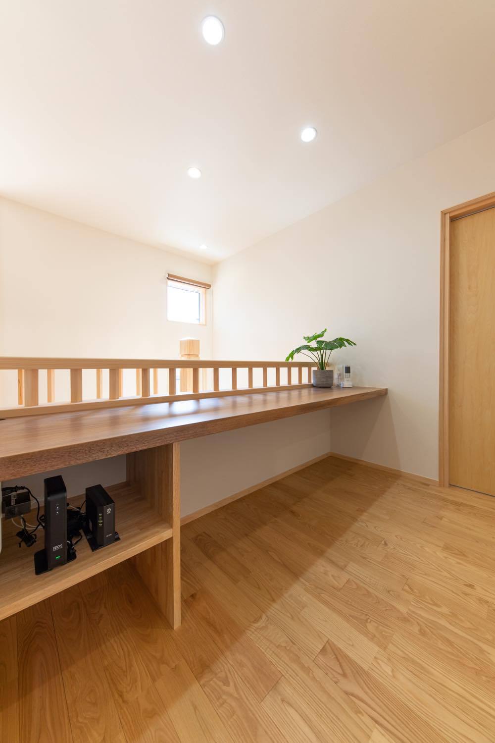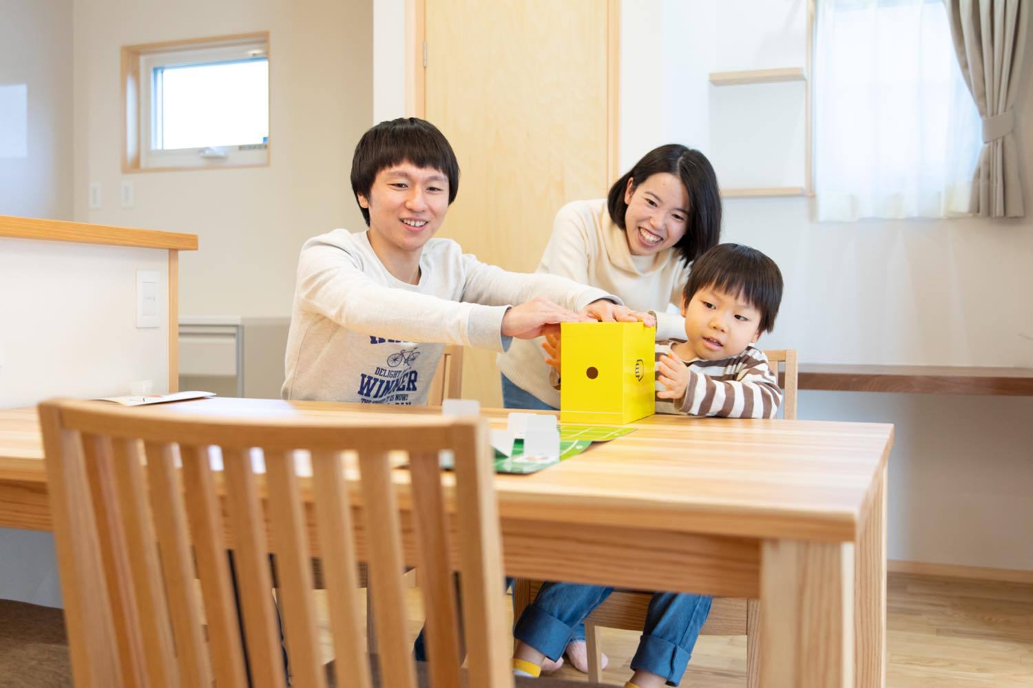 玄関では木の形を活かしたケヤキの上がり框がお出迎え。クリ無垢床の廊下を歩いて奥に進むと、白を基調に明るい色の木を合わせたLDKが広がります。奥さまのたっての希望でダイニングと横並びにしたキッチンは、ぐるりと回れるアイランド型。洗面脱衣室もLDKと廊下の2方向から出入りできる動線を確保しました。2階ホールに造作したブラックウォールナットのカウンターは「部屋以外にも家族の居場所を作りたくて」というご主人の要望を叶えたスペースです。階段や収納はもちろん巾木、窓枠、ドア枠まで木で造られ、大工を生業とするご主人のお父さまも「いい仕事をしている」と太鼓判を押す仕上がり。木の香りに包まれた新居で、Oさん家族の新しい暮らしが始まります。