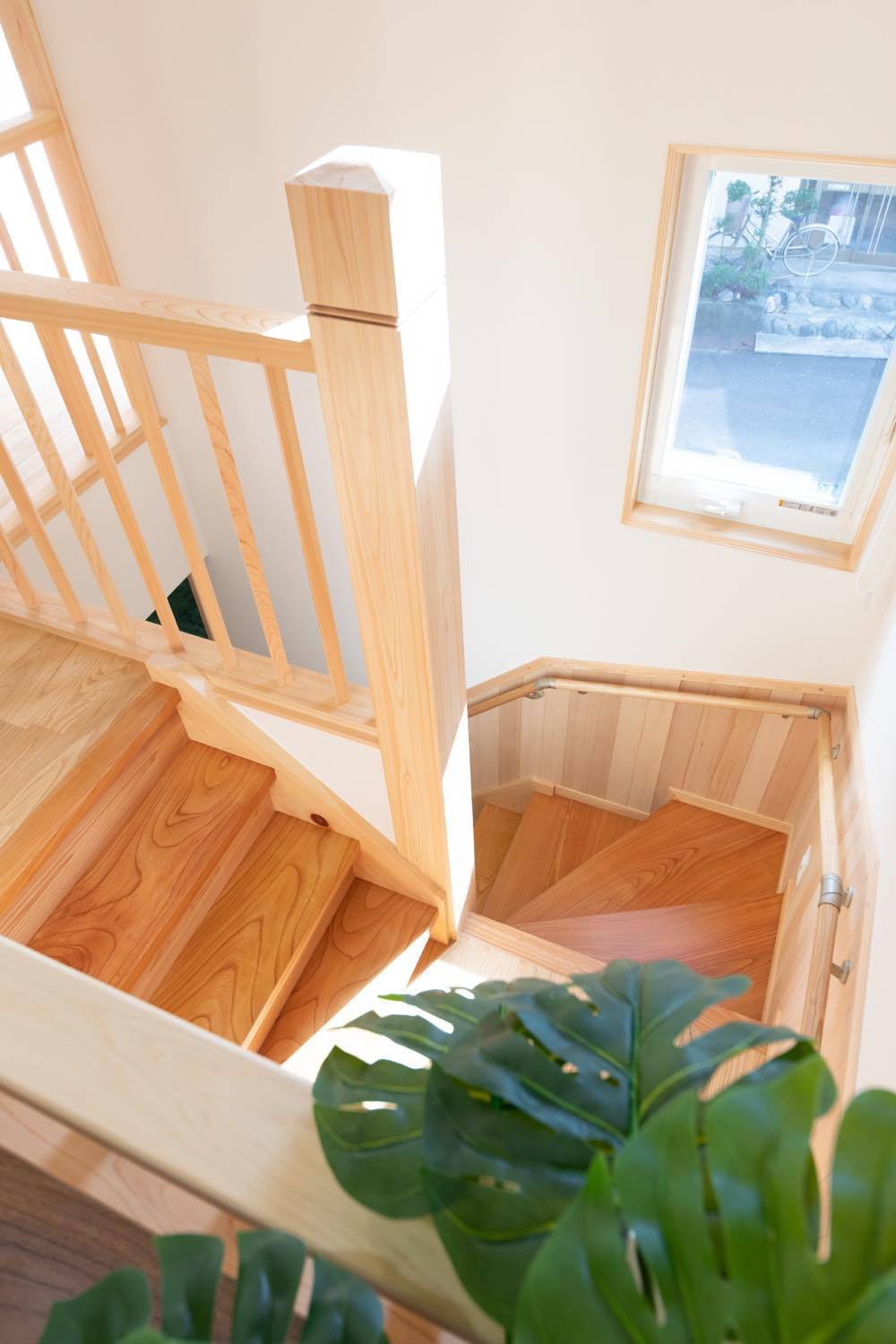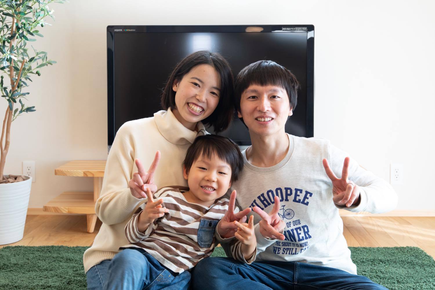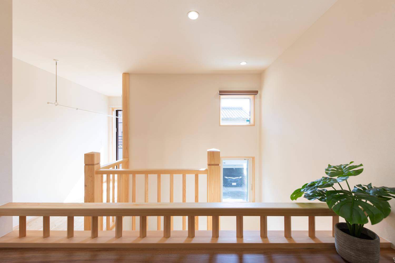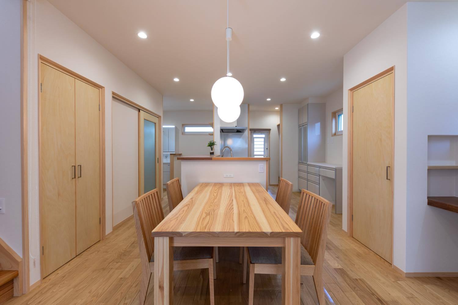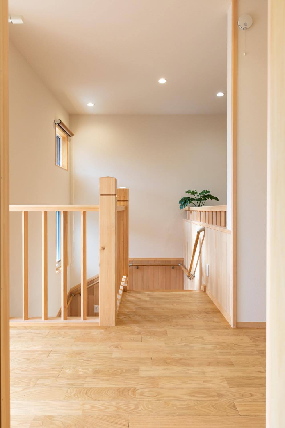 玄関では木の形を活かしたケヤキの上がり框がお出迎え。クリ無垢床の廊下を歩いて奥に進むと、白を基調に明るい色の木を合わせたLDKが広がります。奥さまのたっての希望でダイニングと横並びにしたキッチンは、ぐるりと回れるアイランド型。洗面脱衣室もLDKと廊下の2方向から出入りできる動線を確保しました。2階ホールに造作したブラックウォールナットのカウンターは「部屋以外にも家族の居場所を作りたくて」というご主人の要望を叶えたスペースです。階段や収納はもちろん巾木、窓枠、ドア枠まで木で造られ、大工を生業とするご主人のお父さまも「いい仕事をしている」と太鼓判を押す仕上がり。木の香りに包まれた新居で、Oさん家族の新しい暮らしが始まります。