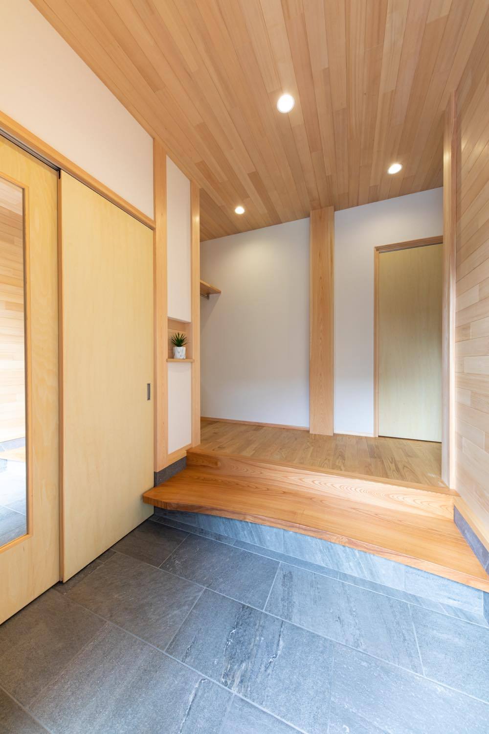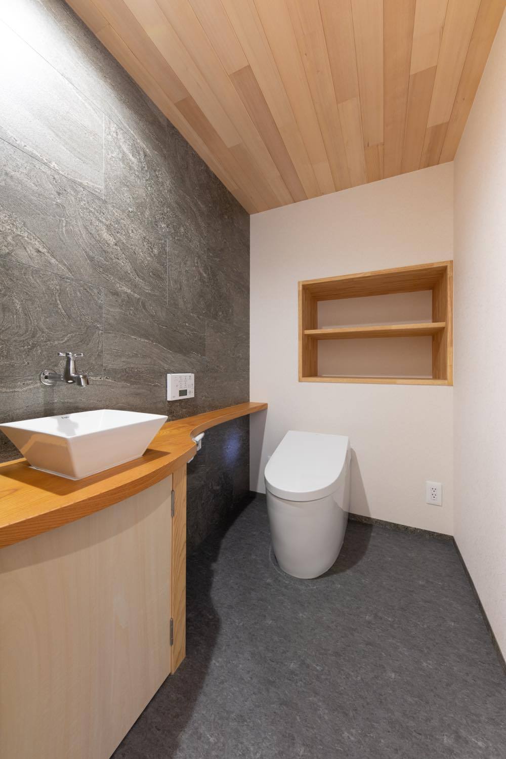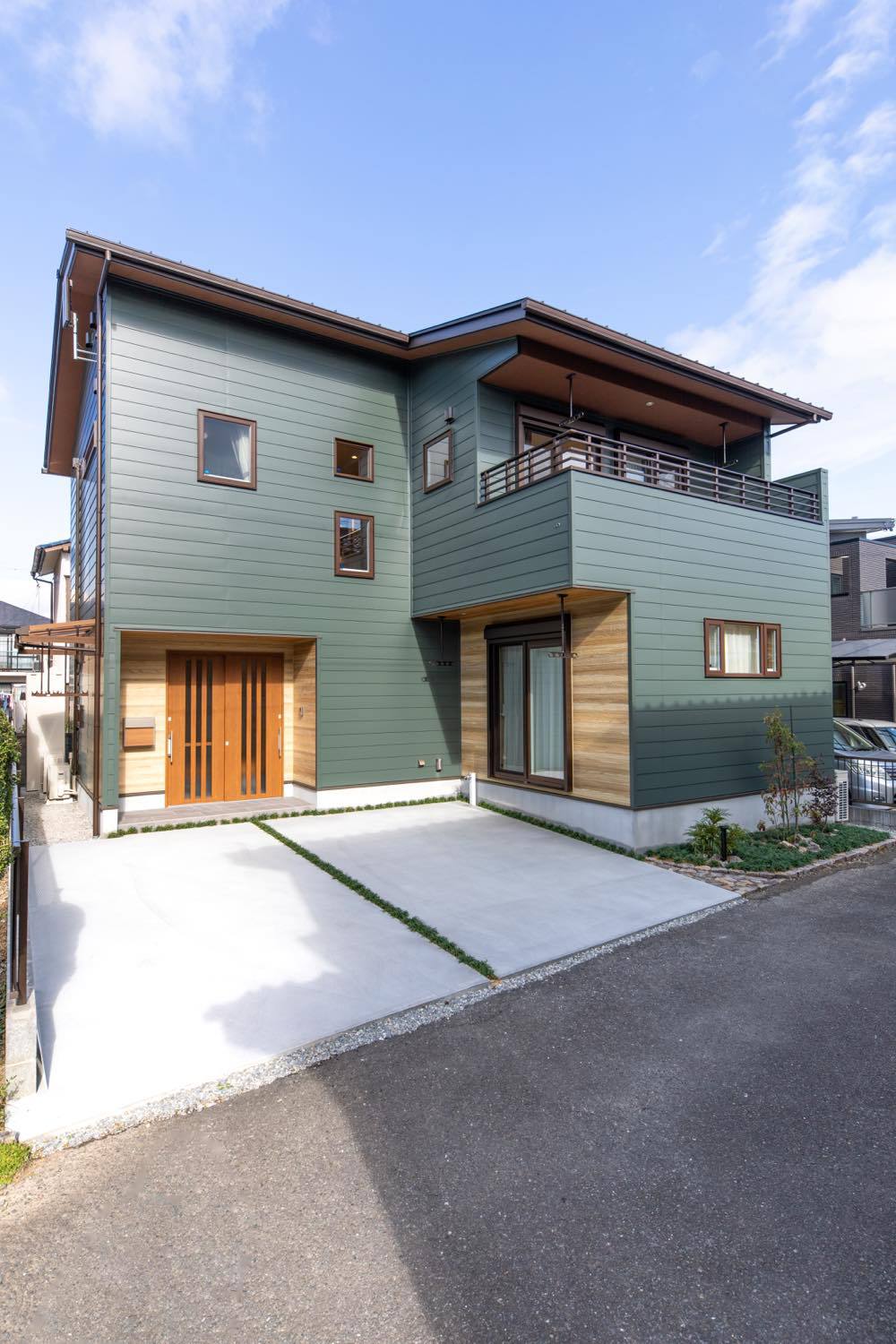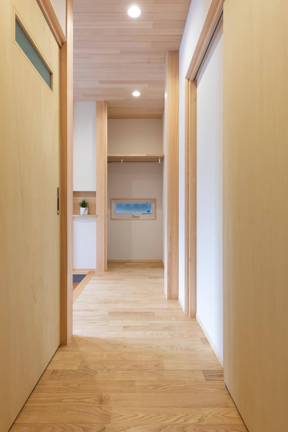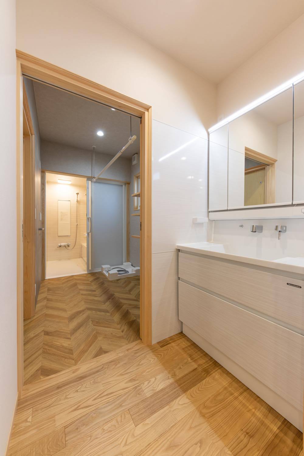 玄関では木の形を活かしたケヤキの上がり框がお出迎え。クリ無垢床の廊下を歩いて奥に進むと、白を基調に明るい色の木を合わせたLDKが広がります。奥さまのたっての希望でダイニングと横並びにしたキッチンは、ぐるりと回れるアイランド型。洗面脱衣室もLDKと廊下の2方向から出入りできる動線を確保しました。2階ホールに造作したブラックウォールナットのカウンターは「部屋以外にも家族の居場所を作りたくて」というご主人の要望を叶えたスペースです。階段や収納はもちろん巾木、窓枠、ドア枠まで木で造られ、大工を生業とするご主人のお父さまも「いい仕事をしている」と太鼓判を押す仕上がり。木の香りに包まれた新居で、Oさん家族の新しい暮らしが始まります。