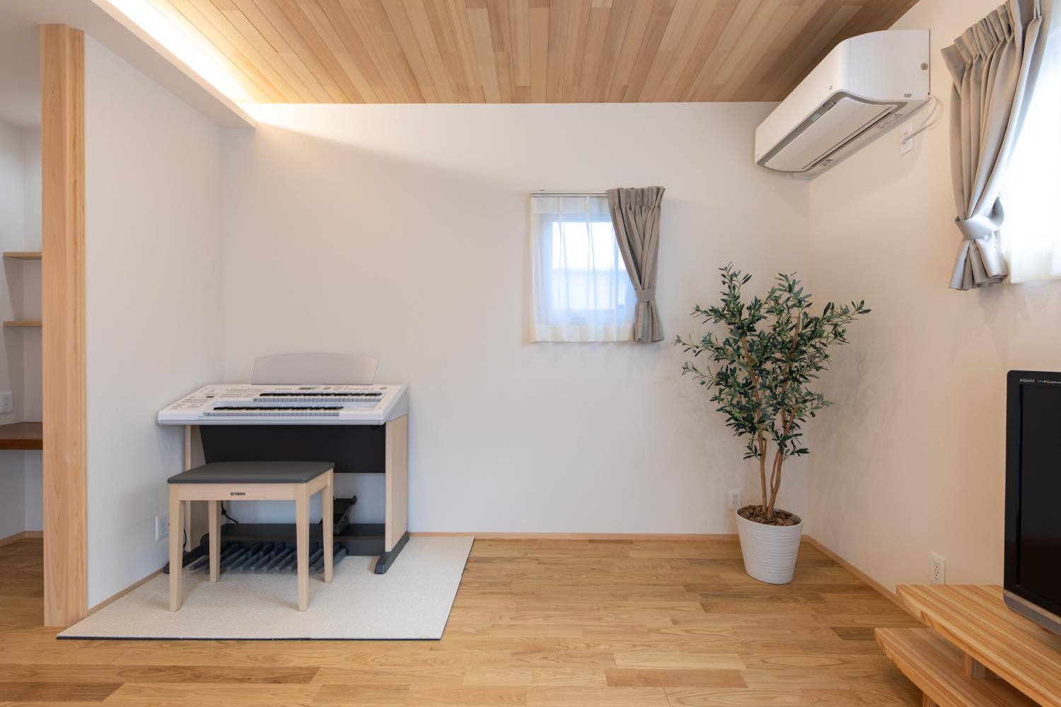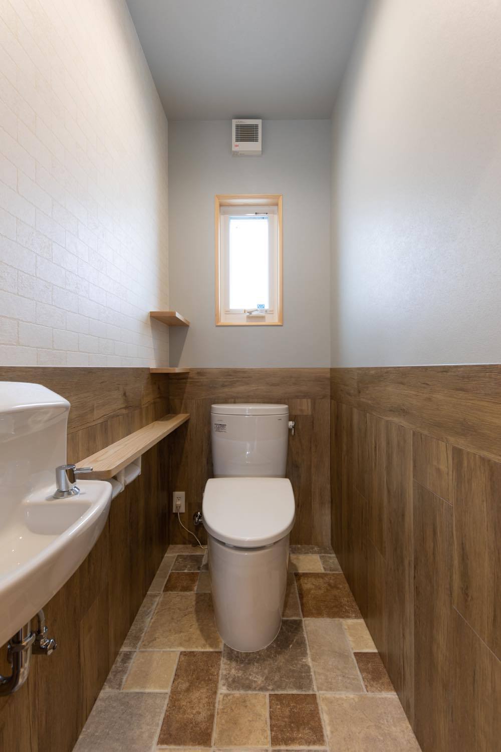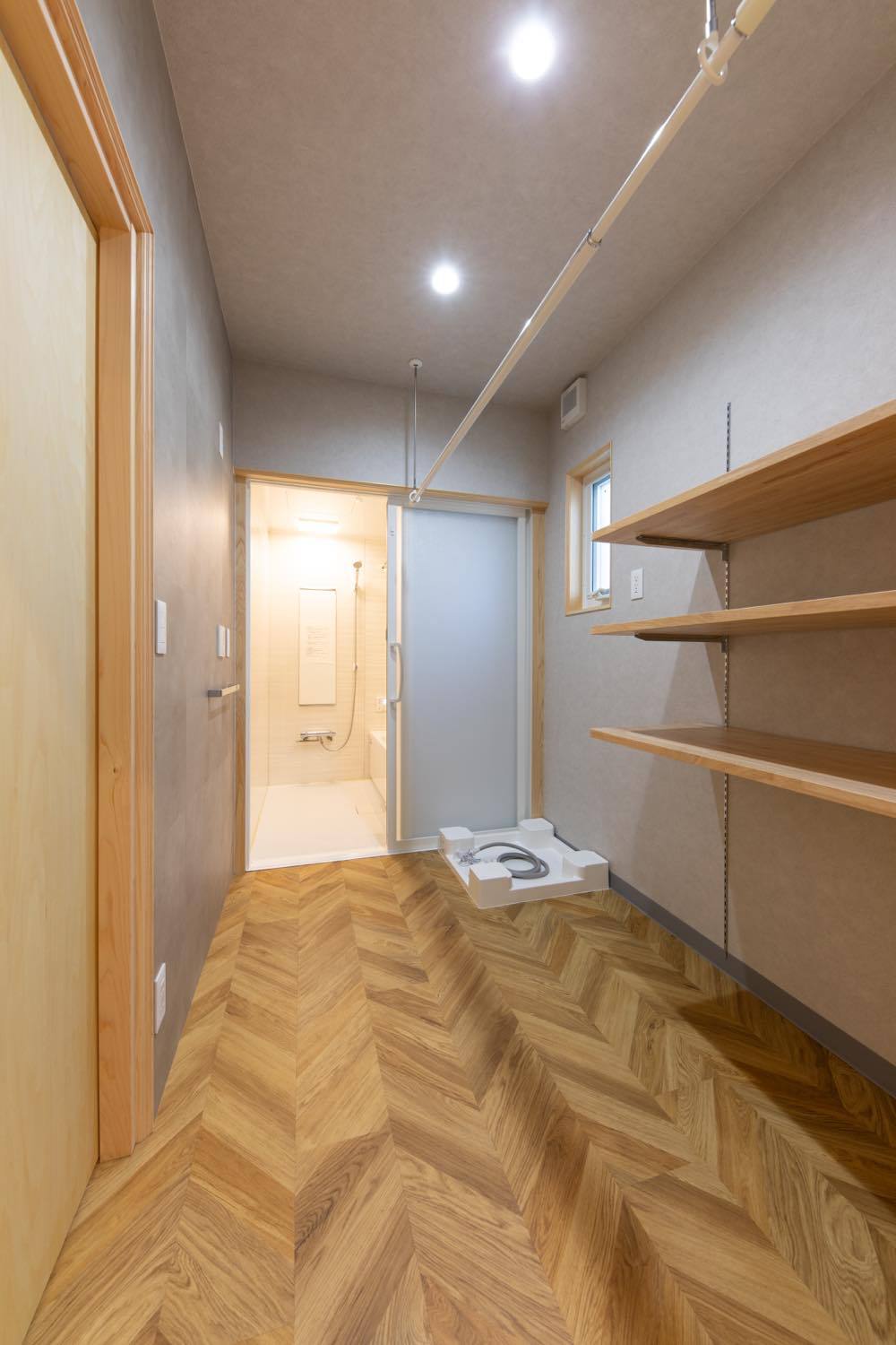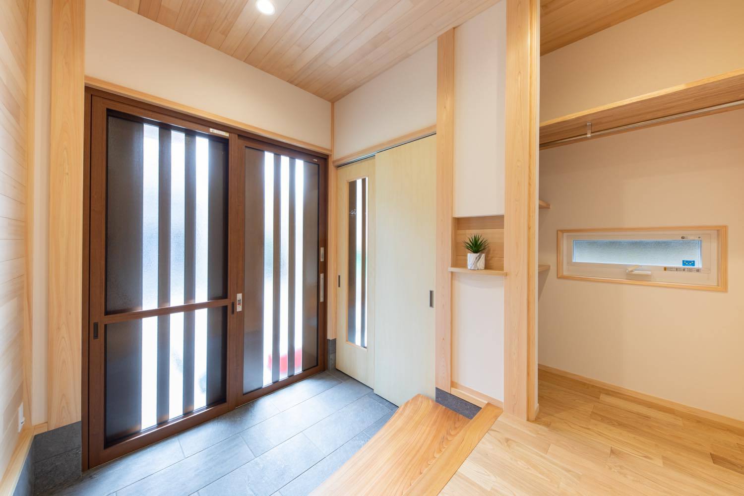 玄関では木の形を活かしたケヤキの上がり框がお出迎え。クリ無垢床の廊下を歩いて奥に進むと、白を基調に明るい色の木を合わせたLDKが広がります。奥さまのたっての希望でダイニングと横並びにしたキッチンは、ぐるりと回れるアイランド型。洗面脱衣室もLDKと廊下の2方向から出入りできる動線を確保しました。2階ホールに造作したブラックウォールナットのカウンターは「部屋以外にも家族の居場所を作りたくて」というご主人の要望を叶えたスペースです。階段や収納はもちろん巾木、窓枠、ドア枠まで木で造られ、大工を生業とするご主人のお父さまも「いい仕事をしている」と太鼓判を押す仕上がり。木の香りに包まれた新居で、Oさん家族の新しい暮らしが始まります。