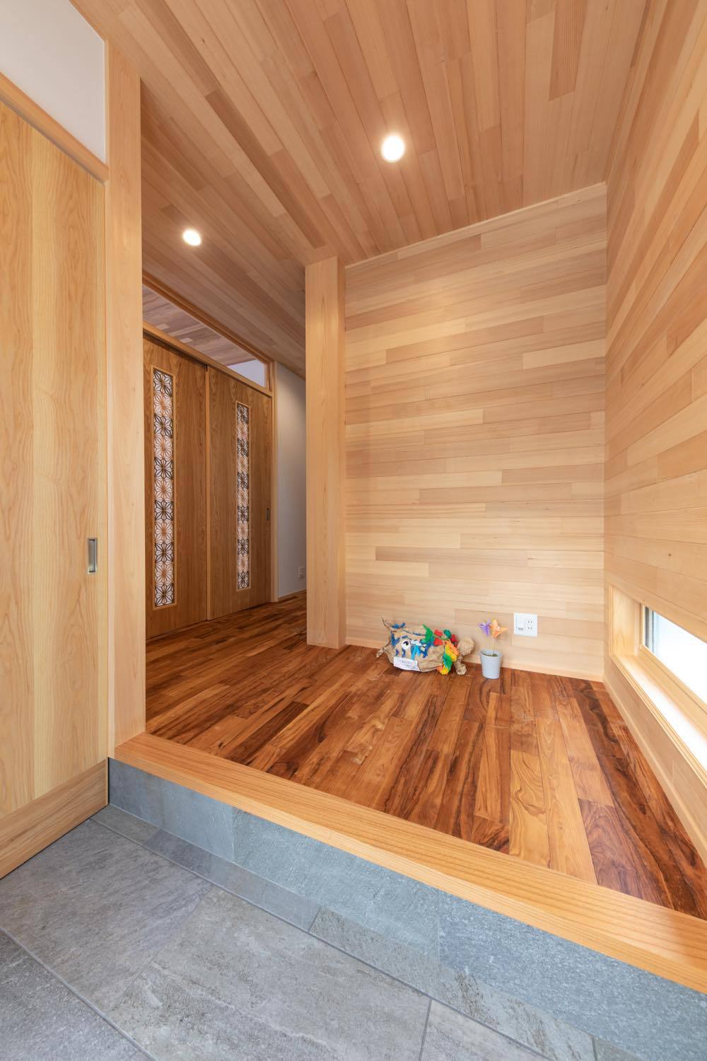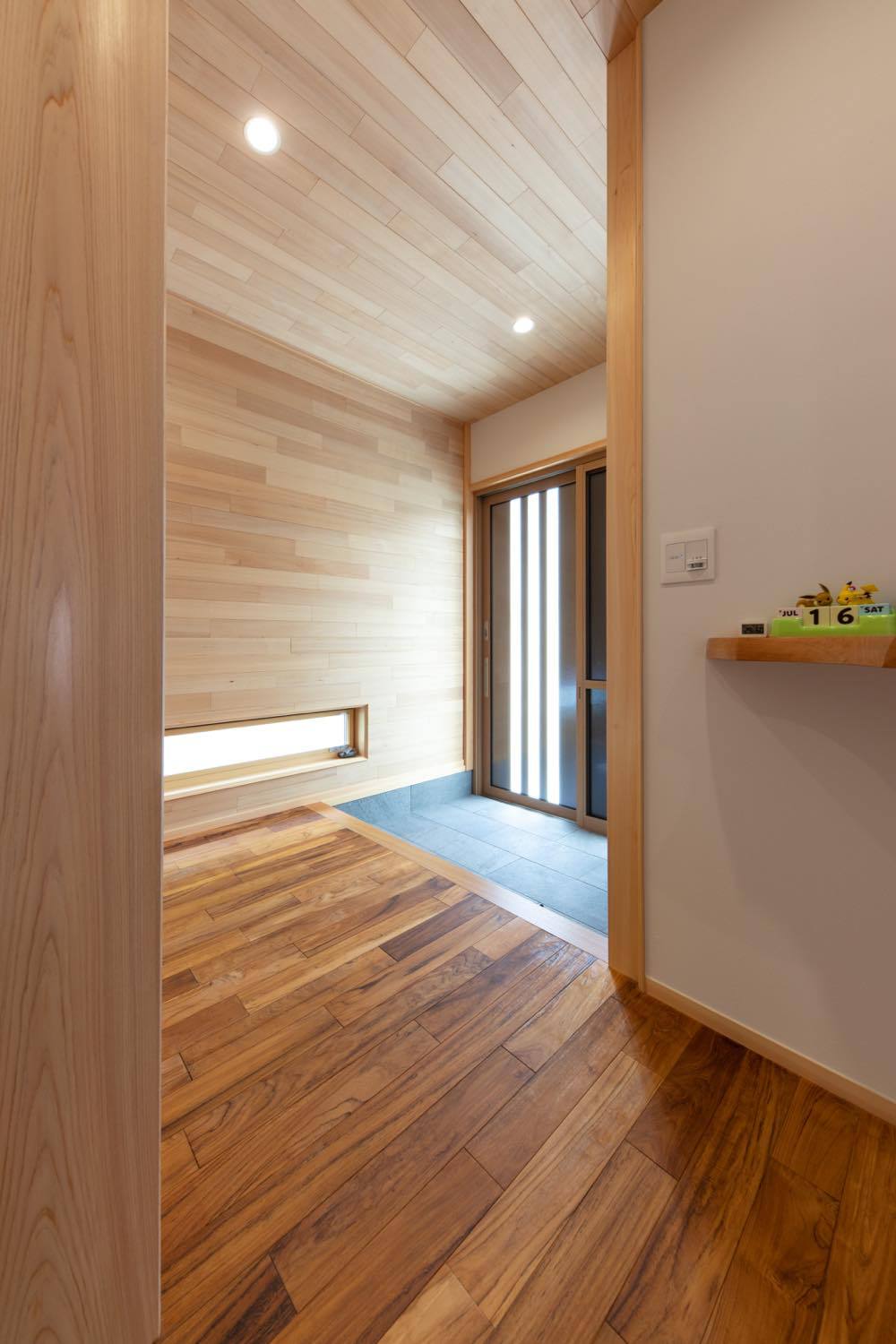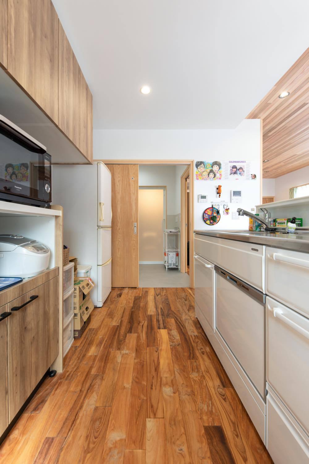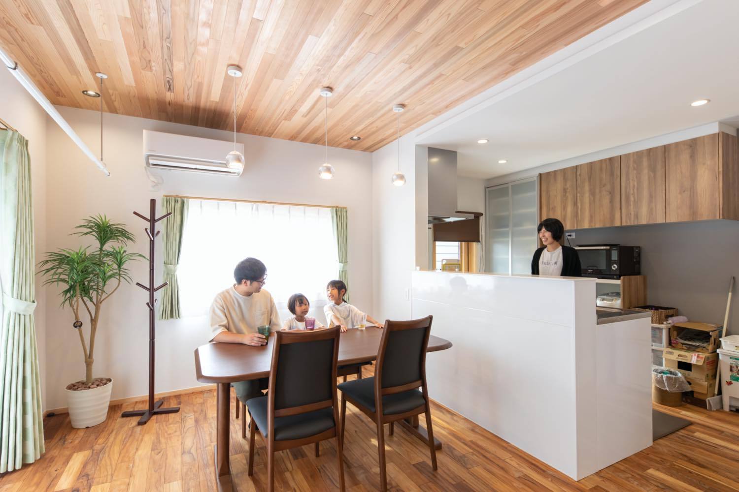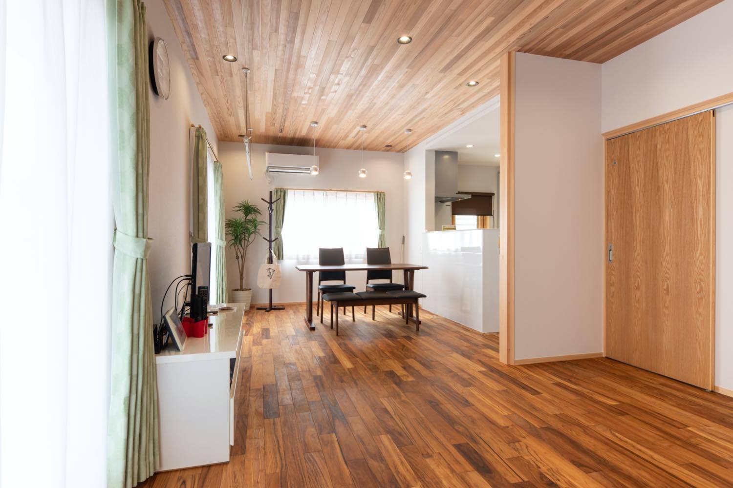 奥さまの父親が大工ということもあり、かねてから「上質な木の家」を望んでいたというIさんご夫妻。奥さまがネットを駆使し、掲示板で運よく『櫻 工務店』の建主OBと出会えたことがアプローチのきっかけになりました。「ゆとりのある玄関」「広いLDK」といった要望が盛り込まれ、できあがったのは、チークの床にスギ板の天井など自然素材に満ちた心地よい家。家族がくつろぐLDKはひとつながりで、20畳という大空間を確保しています。暮らしやすさのポイントは、キッチンから洗面脱衣室、リビングまでコンパクトに動ける回遊動線と、各所に設けた豊富な収納。無垢材の調湿効果で快適に過ごせる上に、端正な木の空間をストレスなくすっきりと保てる理想の住まいが実現しました。