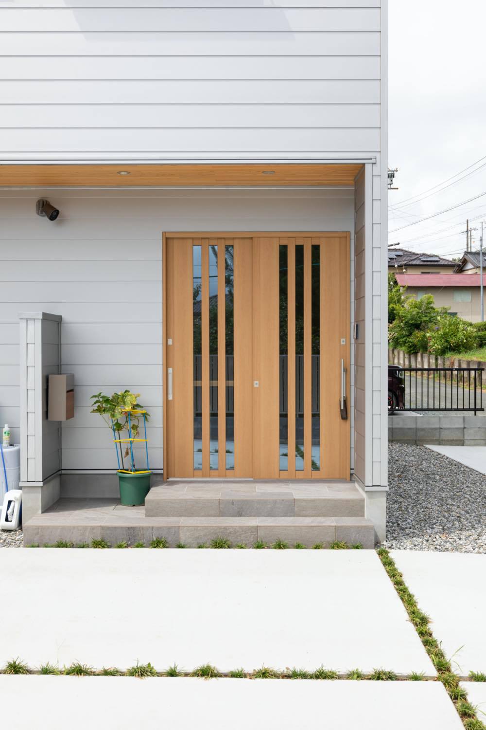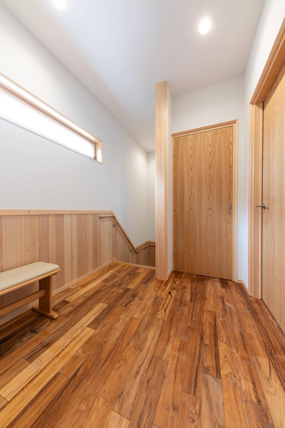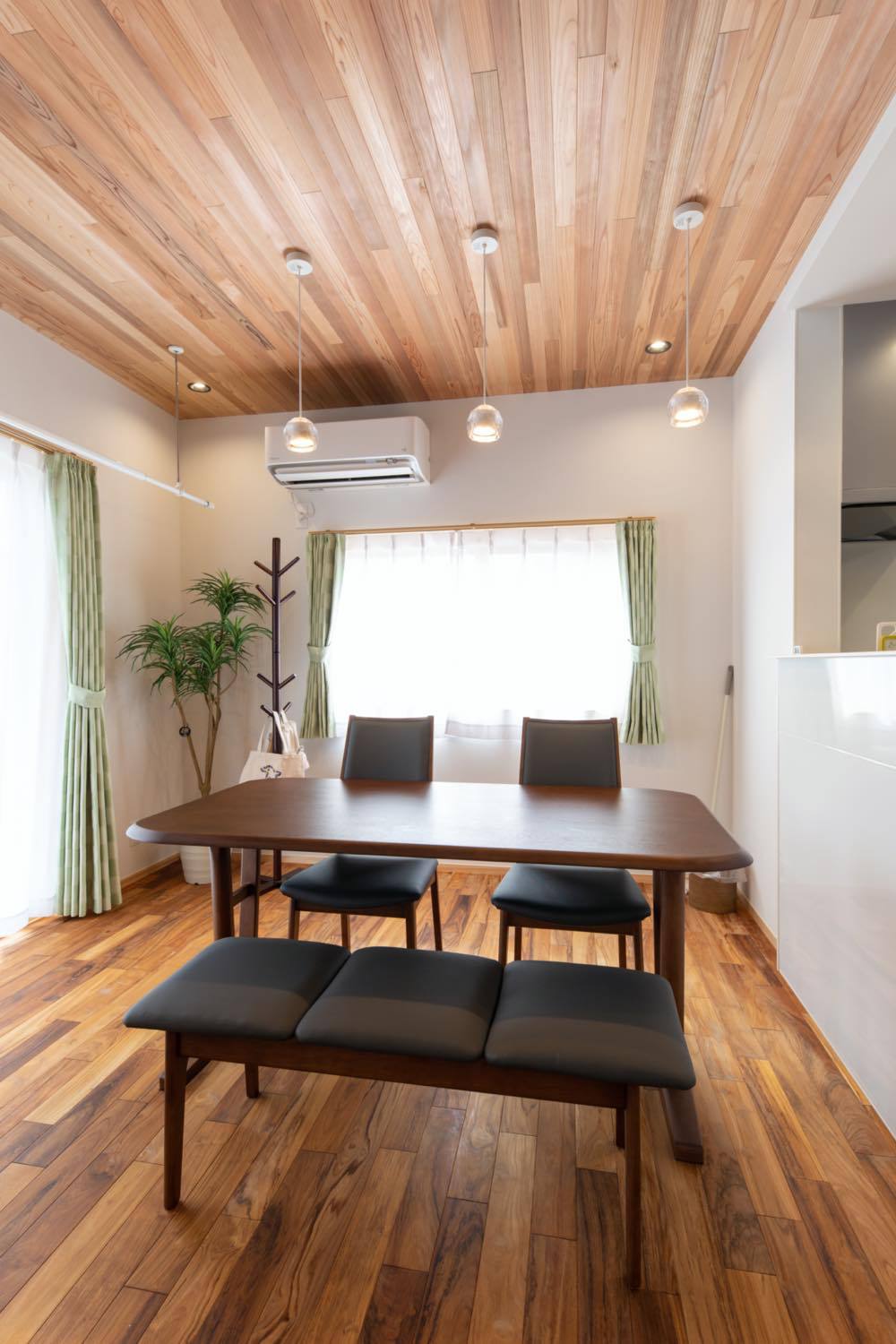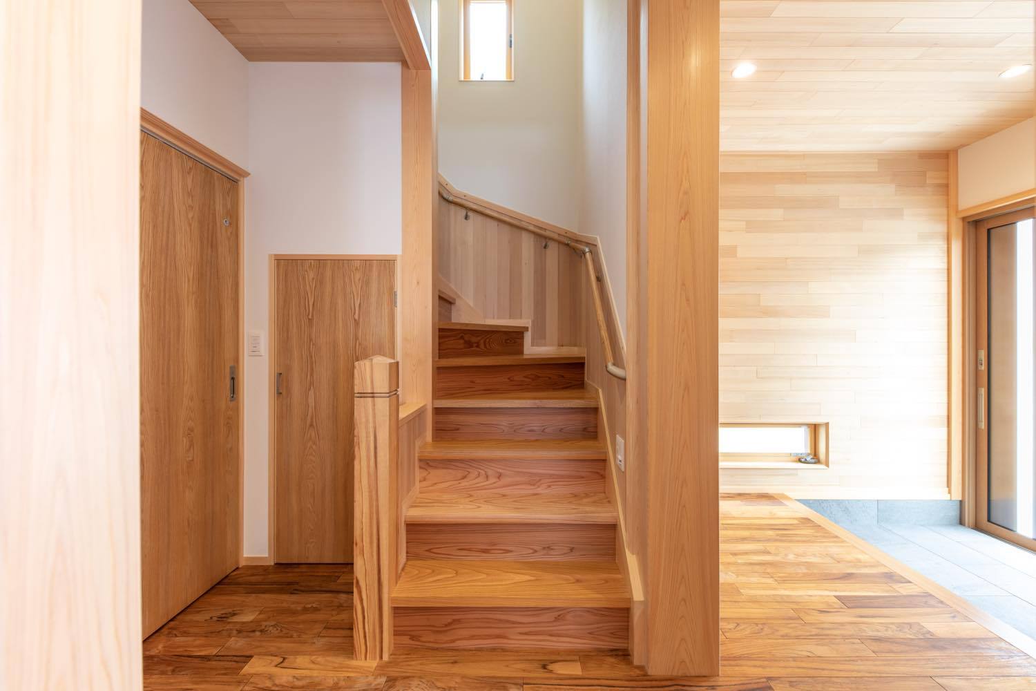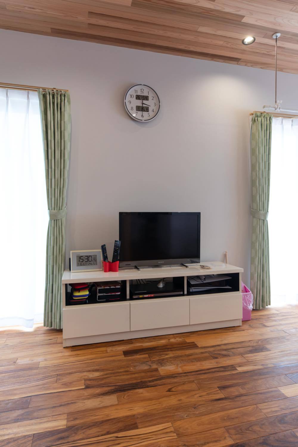 奥さまの父親が大工ということもあり、かねてから「上質な木の家」を望んでいたというIさんご夫妻。奥さまがネットを駆使し、掲示板で運よく『櫻 工務店』の建主OBと出会えたことがアプローチのきっかけになりました。「ゆとりのある玄関」「広いLDK」といった要望が盛り込まれ、できあがったのは、チークの床にスギ板の天井など自然素材に満ちた心地よい家。家族がくつろぐLDKはひとつながりで、20畳という大空間を確保しています。暮らしやすさのポイントは、キッチンから洗面脱衣室、リビングまでコンパクトに動ける回遊動線と、各所に設けた豊富な収納。無垢材の調湿効果で快適に過ごせる上に、端正な木の空間をストレスなくすっきりと保てる理想の住まいが実現しました。