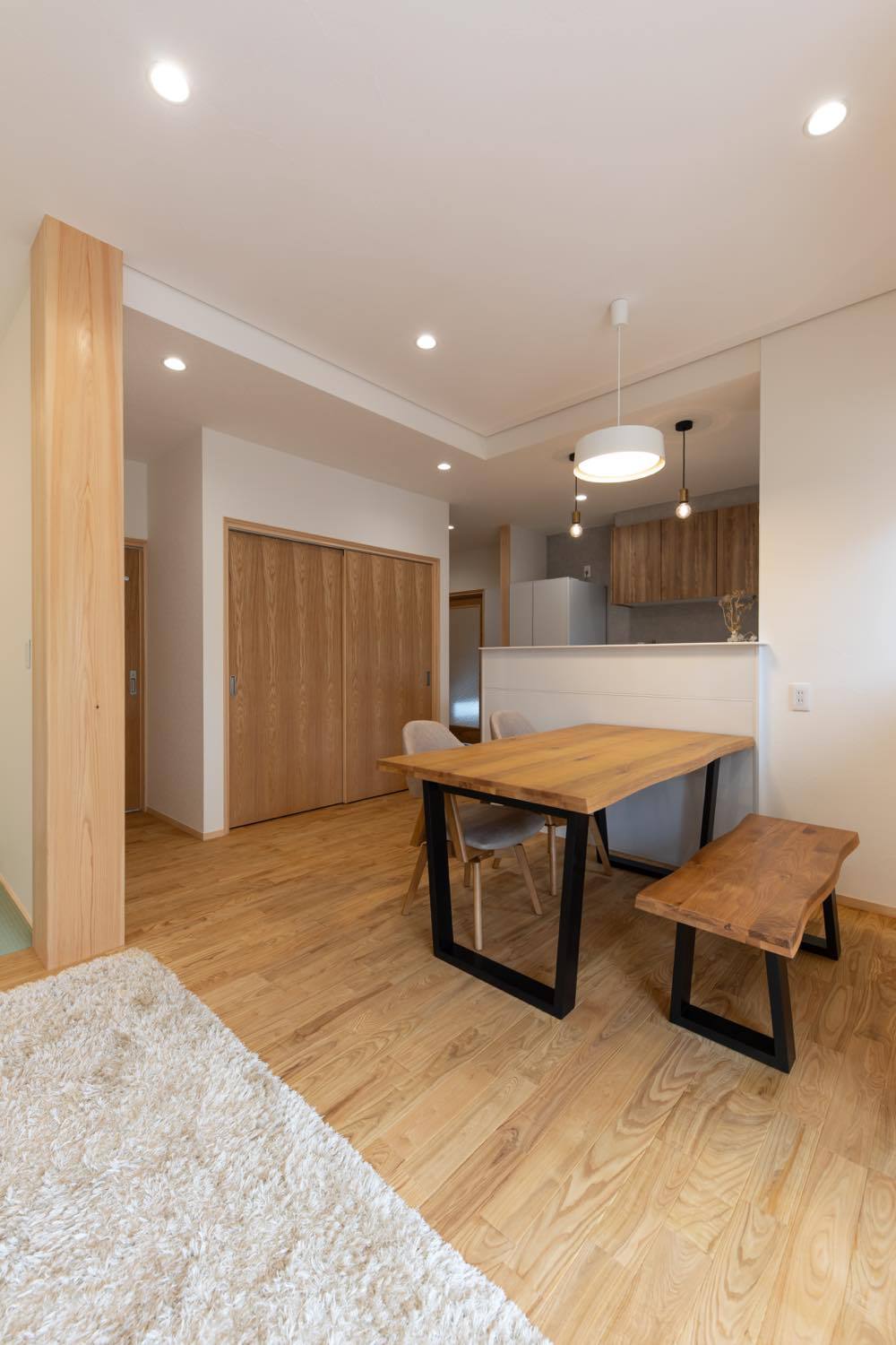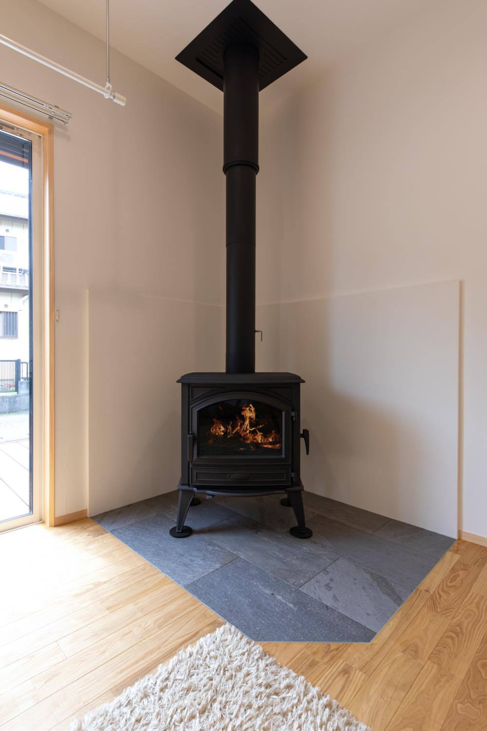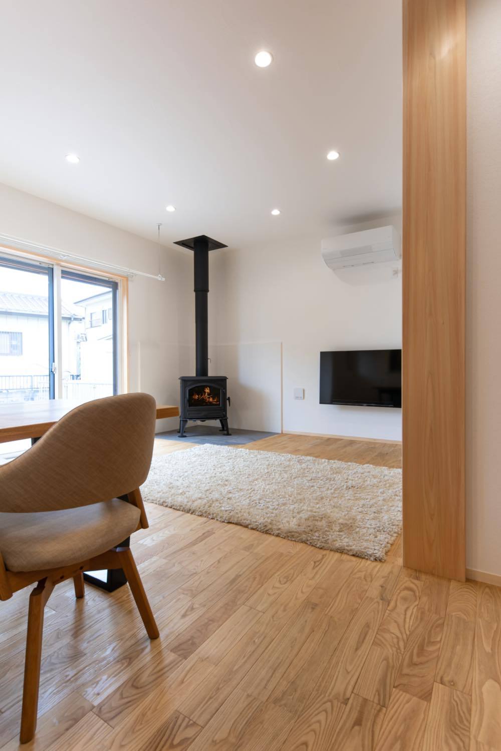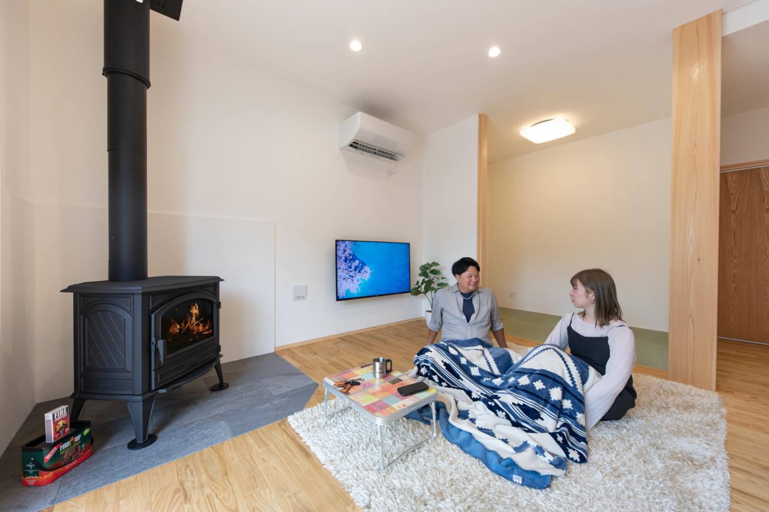 薪ストーブの炎を眺めながら過ごす―。Sさんご夫妻は、こうした暮らしに憧れ、櫻 工務店に夢を託したそうです。薪ストーブは、アウトドア好きのご主人がオーダーしたもの。1階に水回りなどの機能を集中させた無駄のないプランには、「来客と家族用を分けた広い玄関」「パントリー棚付き対面キッチン」「リビングとつながった畳スペース」と、暮らしやすい工夫がちりばめられています。統一感のあるインテリアは、奥さまが「飽きのこないデザイン」を目指し、インスタグラムを参考に壁紙などを吟味。OBさん宅で出合ったクリの床板をベースとし、リビングはコテ跡が残った漆喰の塗り壁に。素材の質感がくつろぎをもたらす、現代の暮らしにフィットする木の家を叶えています。