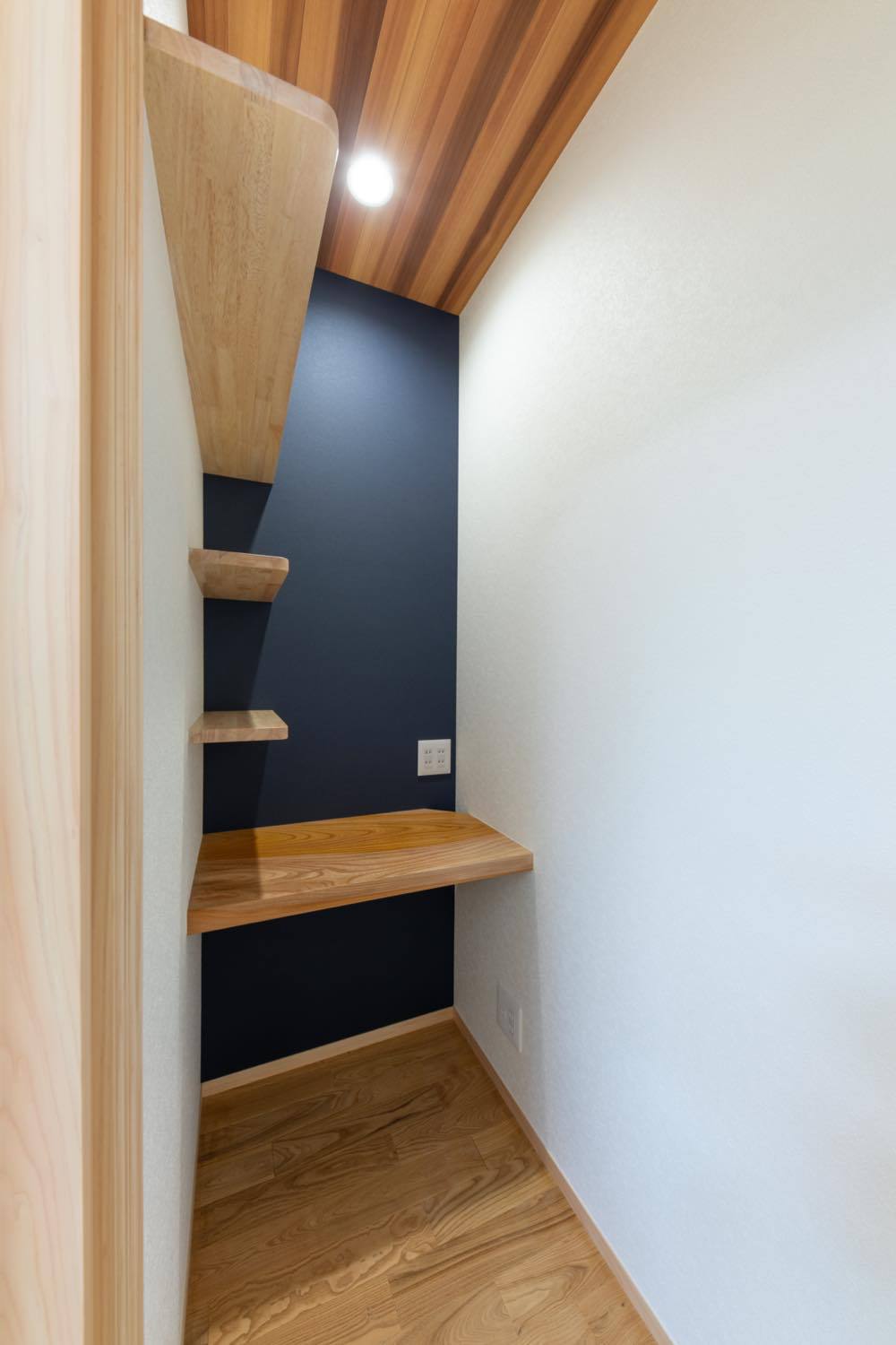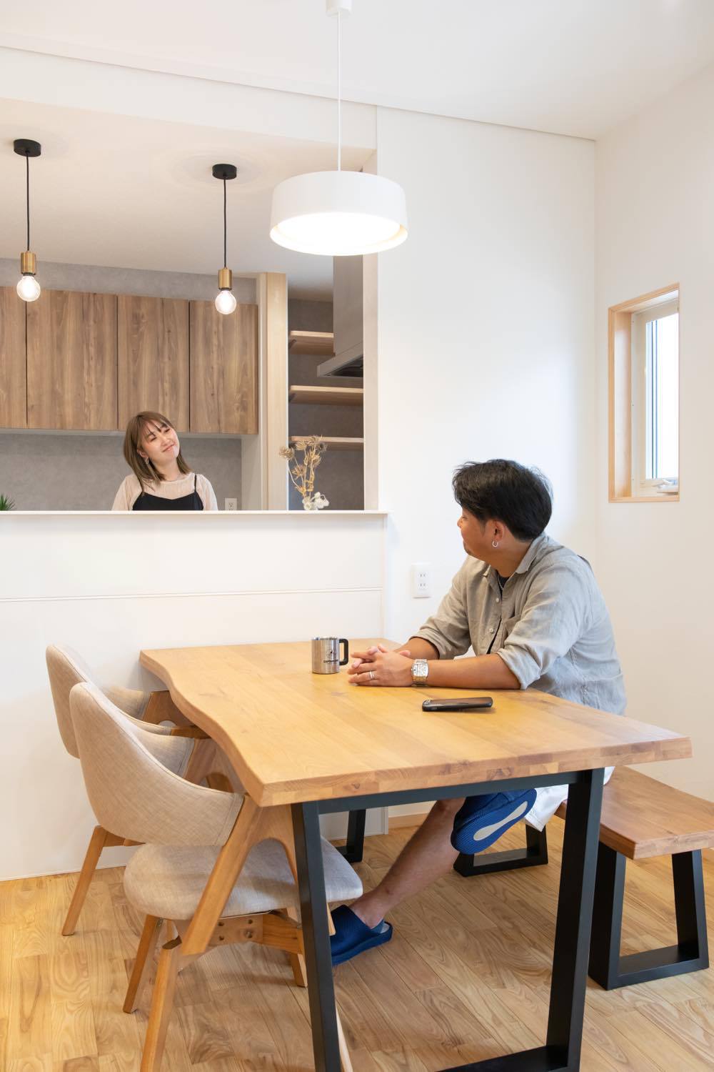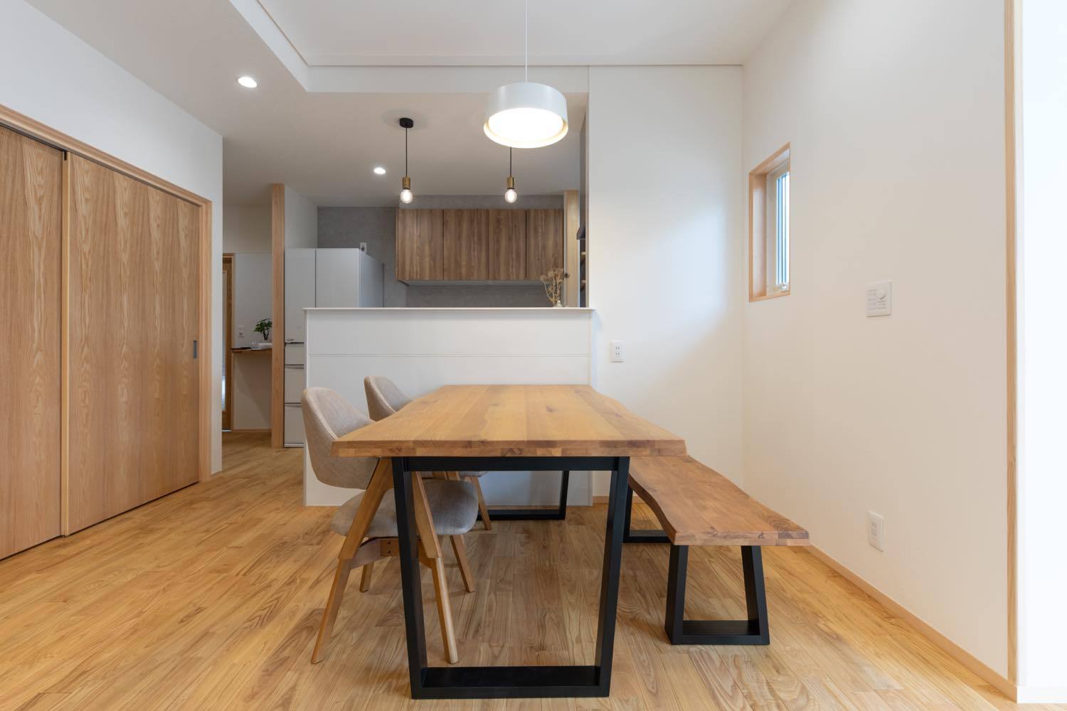薪ストーブの炎を眺めながら過ごす―。Sさんご夫妻は、こうした暮らしに憧れ、櫻 工務店に夢を託したそうです。薪ストーブは、アウトドア好きのご主人がオーダーしたもの。1階に水回りなどの機能を集中させた無駄のないプランには、「来客と家族用を分けた広い玄関」「パントリー棚付き対面キッチン」「リビングとつながった畳スペース」と、暮らしやすい工夫がちりばめられています。統一感のあるインテリアは、奥さまが「飽きのこないデザイン」を目指し、インスタグラムを参考に壁紙などを吟味。OBさん宅で出合ったクリの床板をベースとし、リビングはコテ跡が残った漆喰の塗り壁に。素材の質感がくつろぎをもたらす、現代の暮らしにフィットする木の家を叶えています。