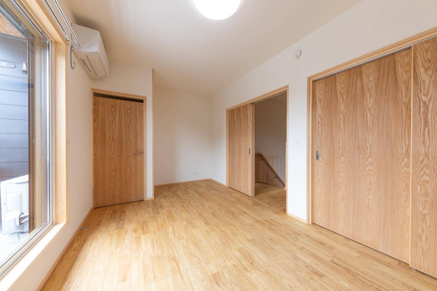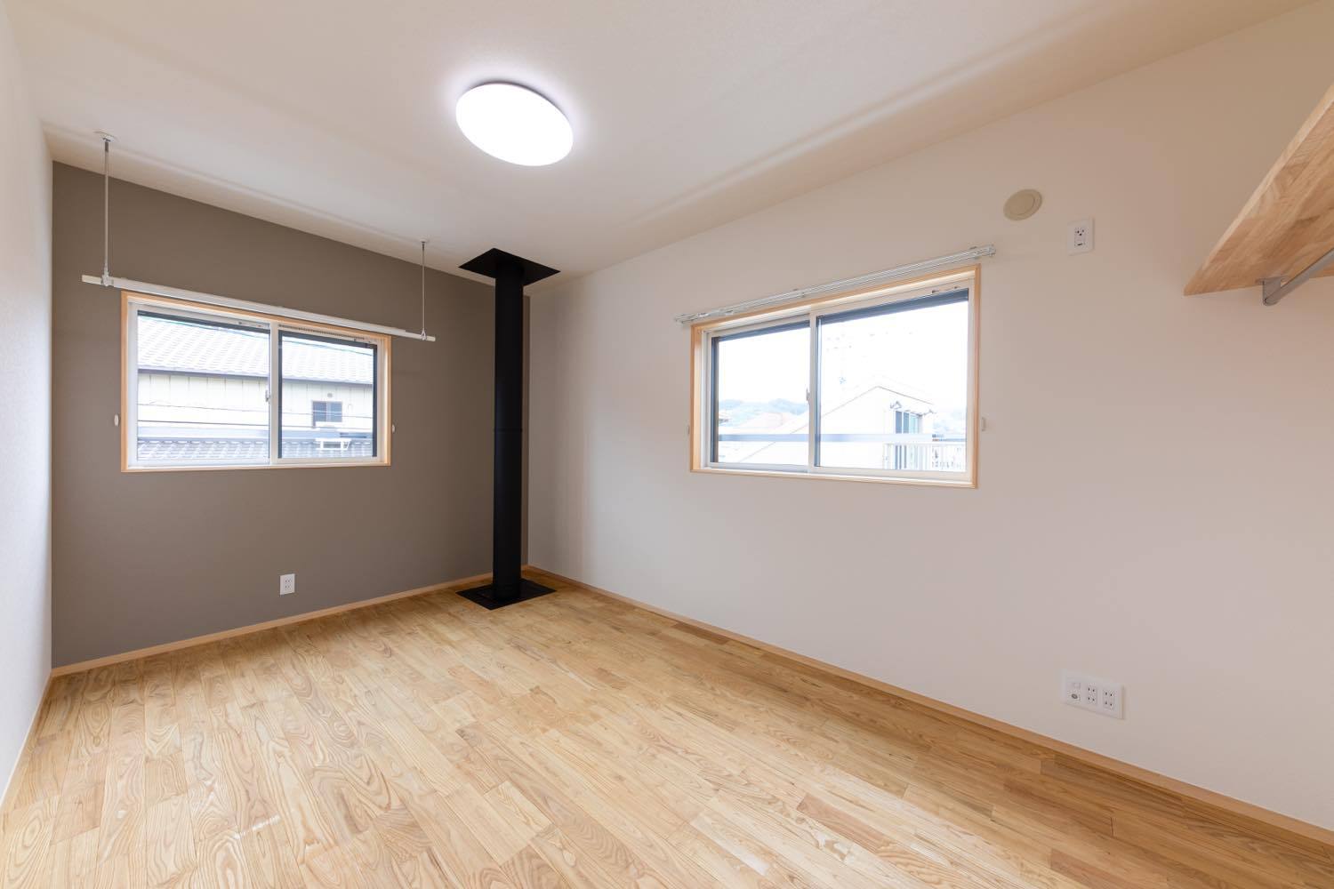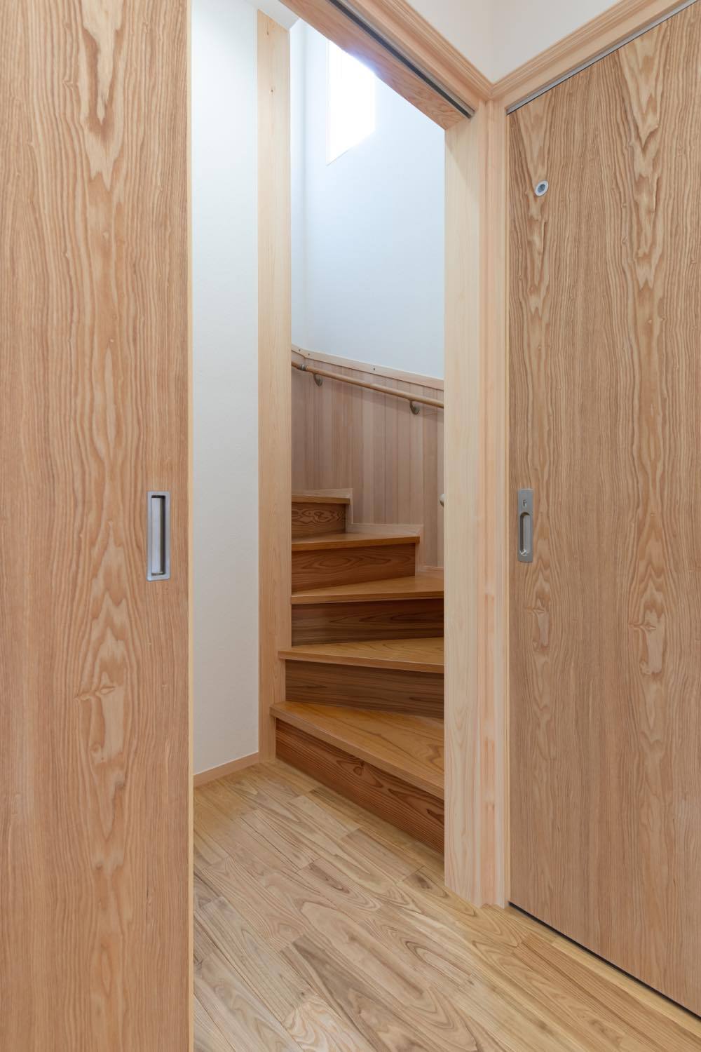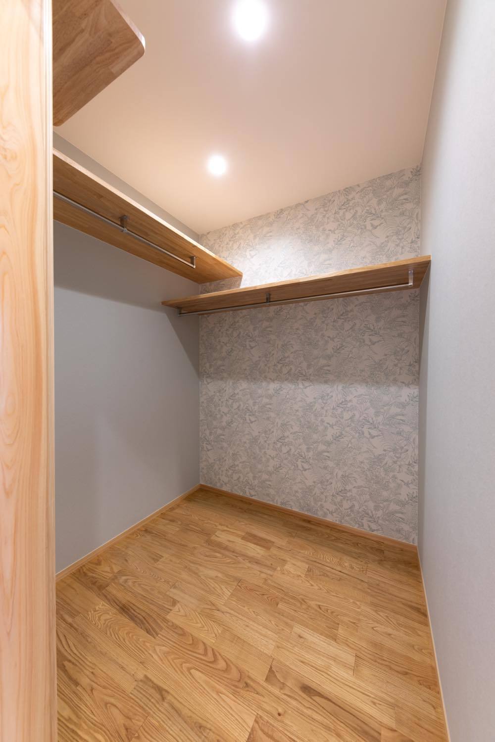 薪ストーブの炎を眺めながら過ごす―。Sさんご夫妻は、こうした暮らしに憧れ、櫻 工務店に夢を託したそうです。薪ストーブは、アウトドア好きのご主人がオーダーしたもの。1階に水回りなどの機能を集中させた無駄のないプランには、「来客と家族用を分けた広い玄関」「パントリー棚付き対面キッチン」「リビングとつながった畳スペース」と、暮らしやすい工夫がちりばめられています。統一感のあるインテリアは、奥さまが「飽きのこないデザイン」を目指し、インスタグラムを参考に壁紙などを吟味。OBさん宅で出合ったクリの床板をベースとし、リビングはコテ跡が残った漆喰の塗り壁に。素材の質感がくつろぎをもたらす、現代の暮らしにフィットする木の家を叶えています。