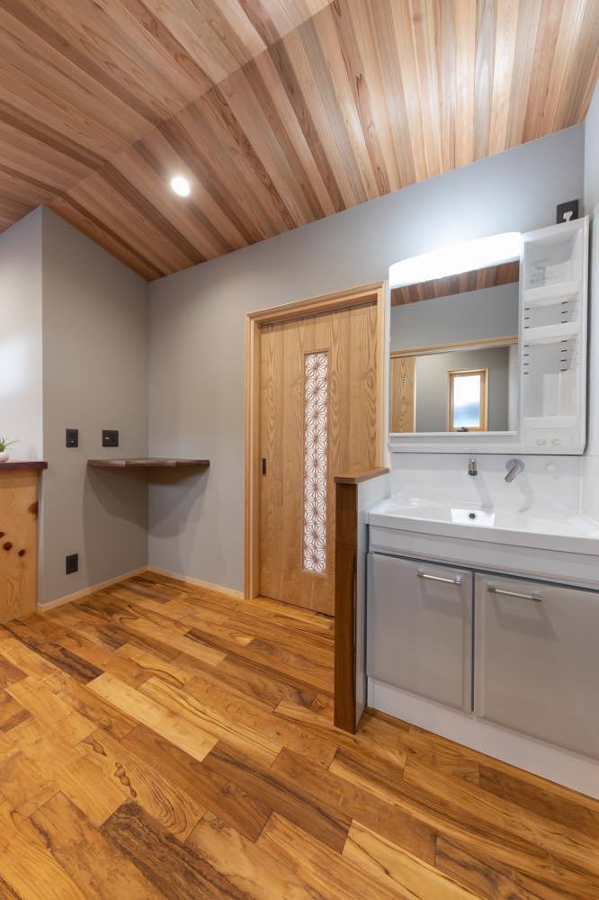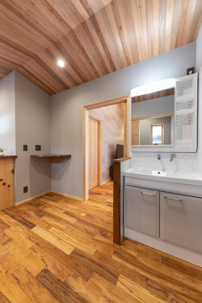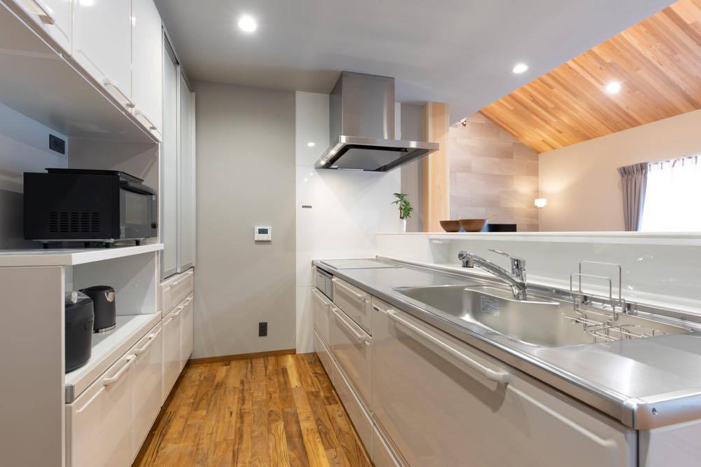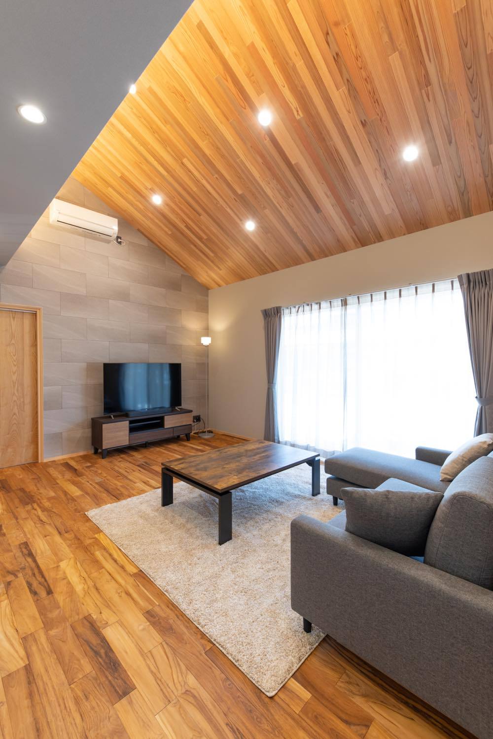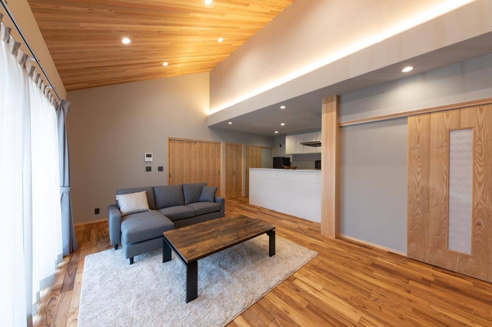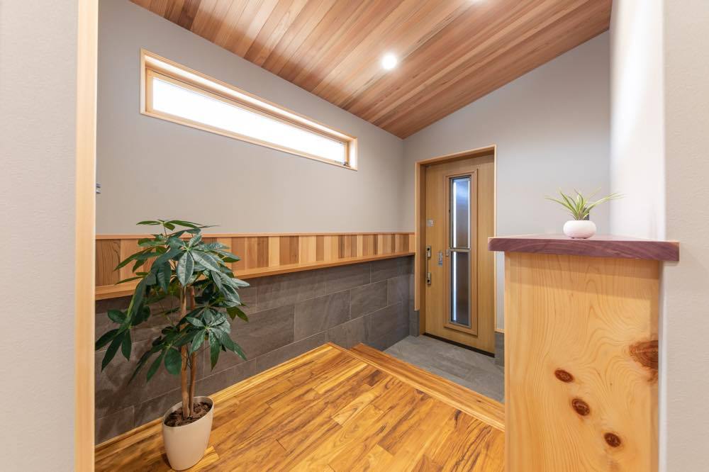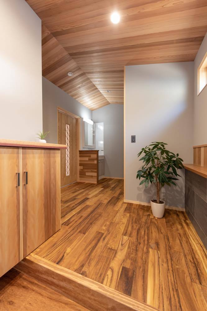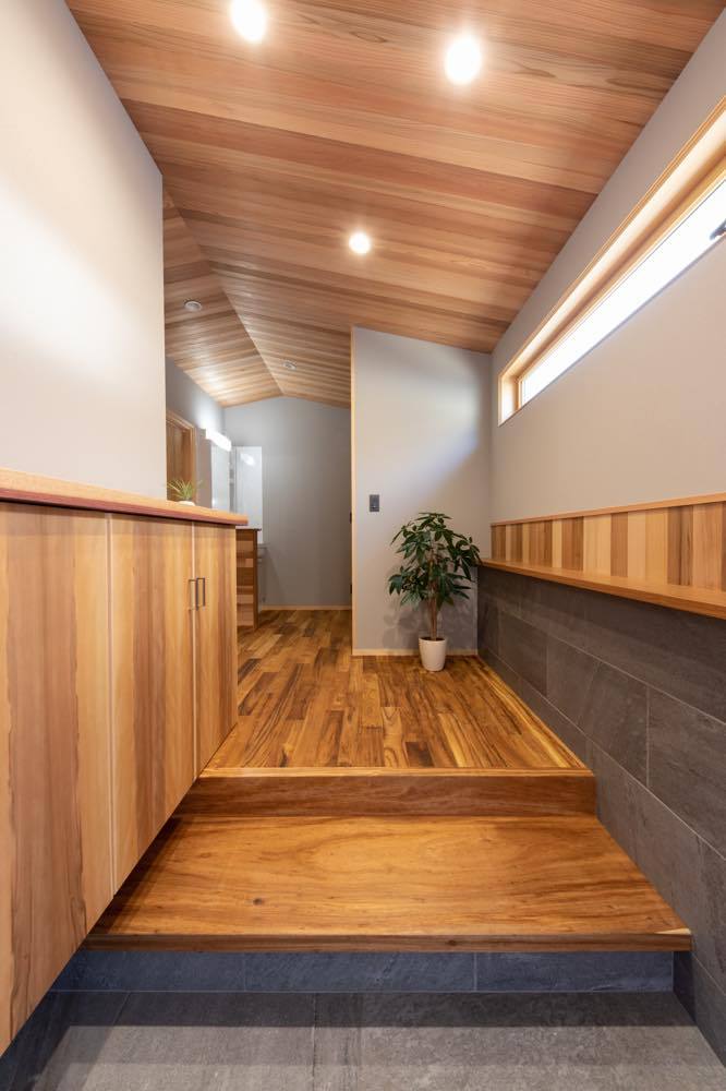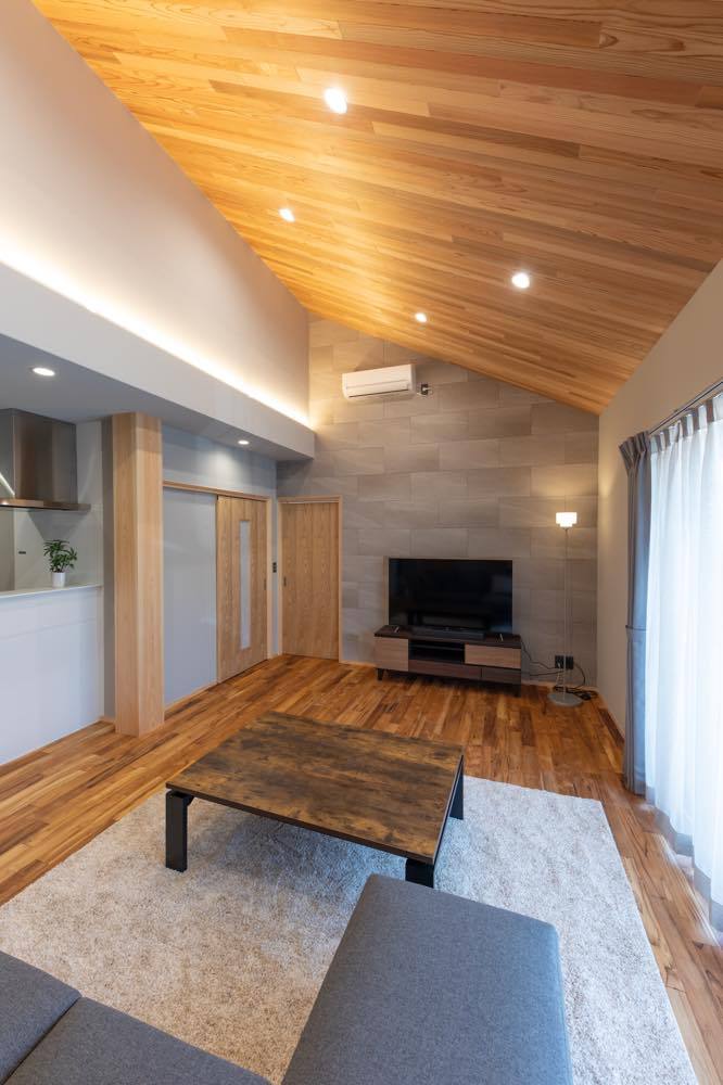 子どもが巣立ったのを機に、夫婦2人の終の住処の準備をしようと思い立ったAさん夫妻。最初は吹き抜けのある2階建を希望していましたが、必要な部屋数や将来の生活しやすさを考えて、櫻井社長が平屋を提案。屋根の傾斜を大きくして室内にも反映させたリビングは、高さのある勾配天井が開放感を感じさせます。キッチンとリビングを仕切る下がり壁には間接照明を入れ、壁の一面をタイル風のアクセントウォールに。木の自然なぬくもりを活かした洋風テイストのデザインに仕上がっています。小屋根付きの玄関ポーチは雨よけだけでなく周囲からの視線を遮る造りで、自転車置き場も設置。造作した靴箱の上にはパープルがかった貴重な無垢の一枚板を使い、既製品にはないオリジナルな仕様が目を引きます。
