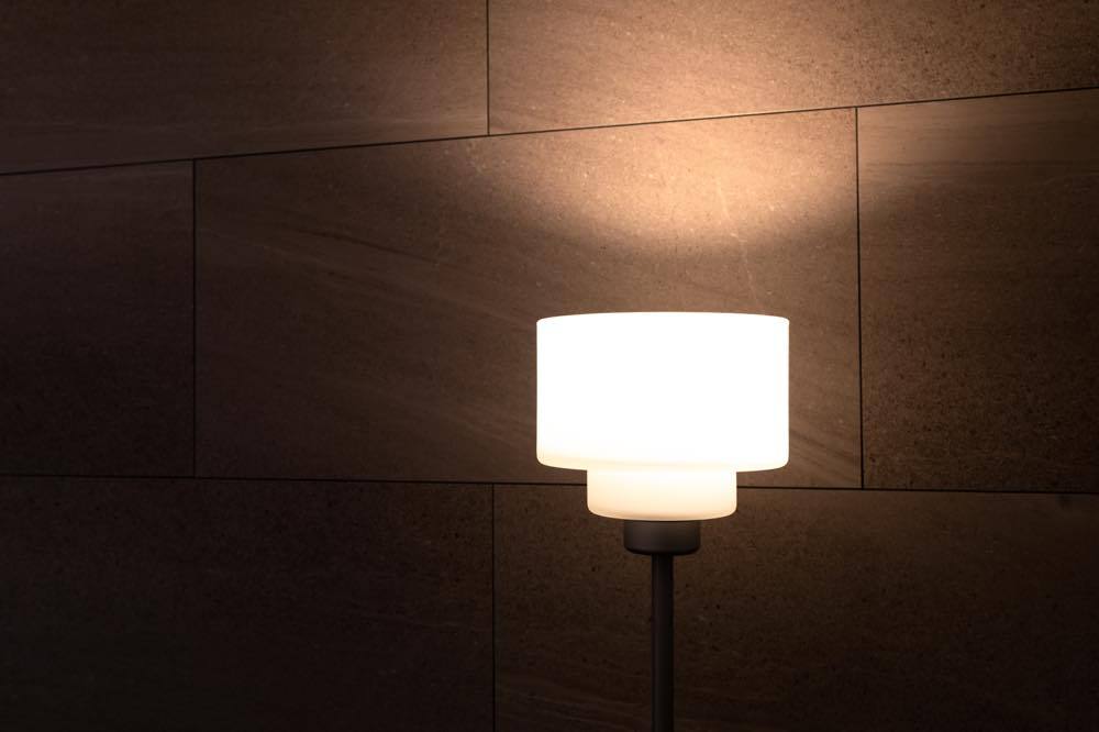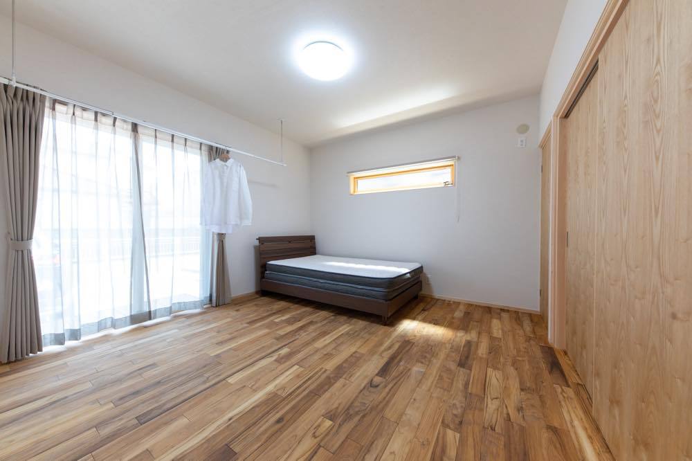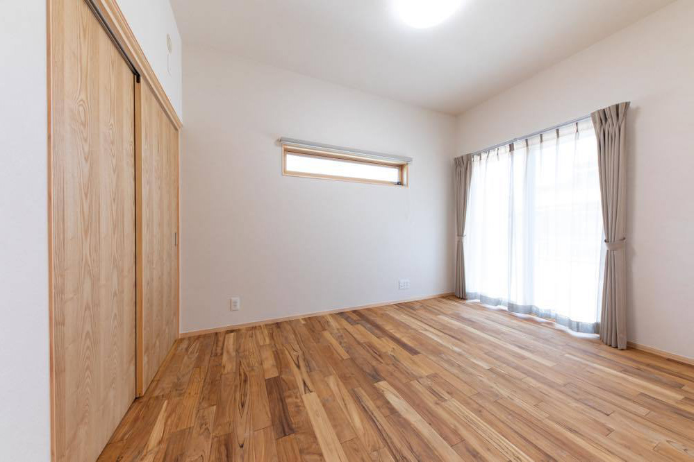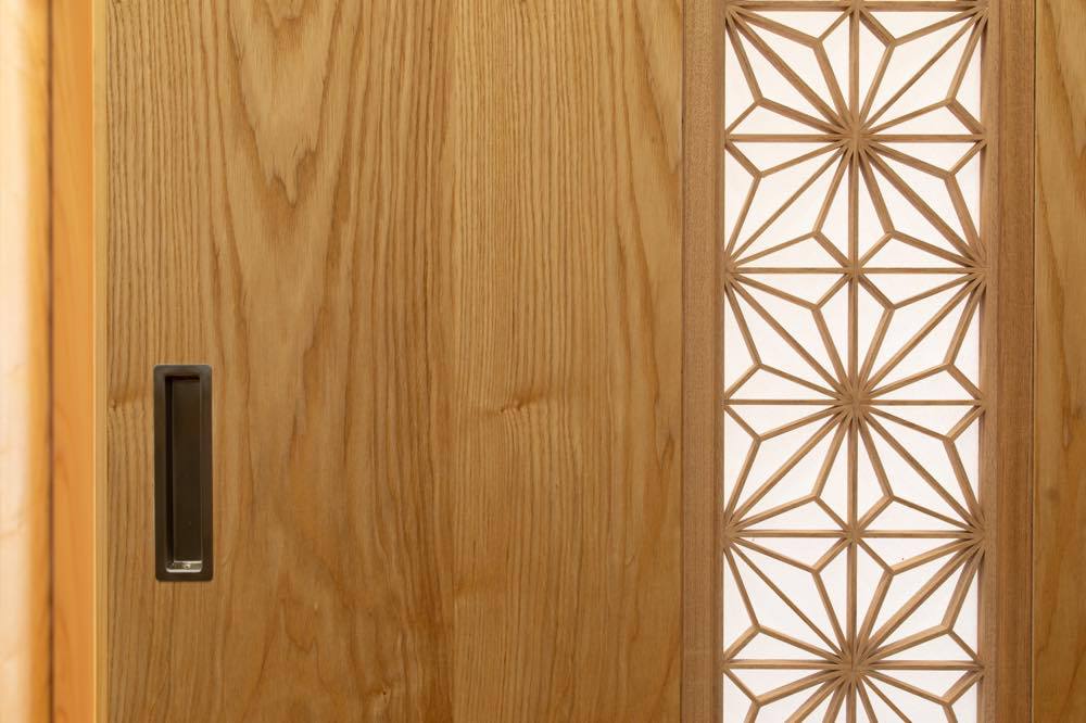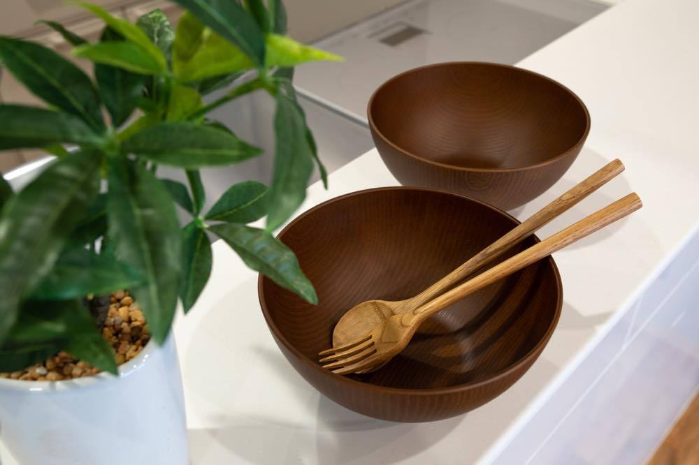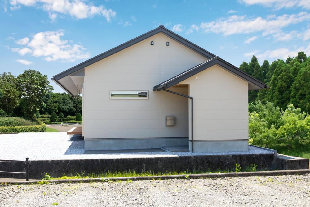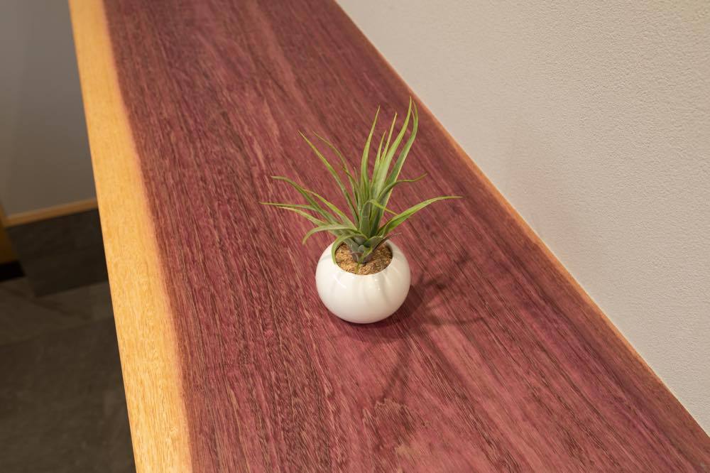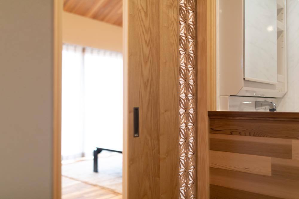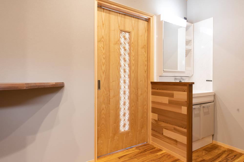 子どもが巣立ったのを機に、夫婦2人の終の住処の準備をしようと思い立ったAさん夫妻。最初は吹き抜けのある2階建を希望していましたが、必要な部屋数や将来の生活しやすさを考えて、櫻井社長が平屋を提案。屋根の傾斜を大きくして室内にも反映させたリビングは、高さのある勾配天井が開放感を感じさせます。キッチンとリビングを仕切る下がり壁には間接照明を入れ、壁の一面をタイル風のアクセントウォールに。木の自然なぬくもりを活かした洋風テイストのデザインに仕上がっています。小屋根付きの玄関ポーチは雨よけだけでなく周囲からの視線を遮る造りで、自転車置き場も設置。造作した靴箱の上にはパープルがかった貴重な無垢の一枚板を使い、既製品にはないオリジナルな仕様が目を引きます。
