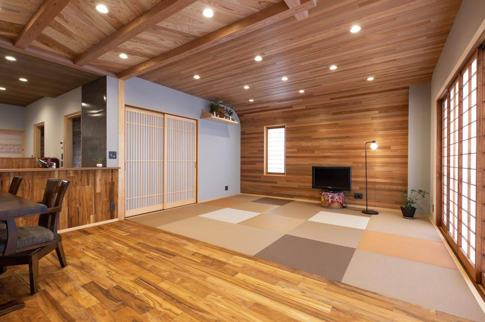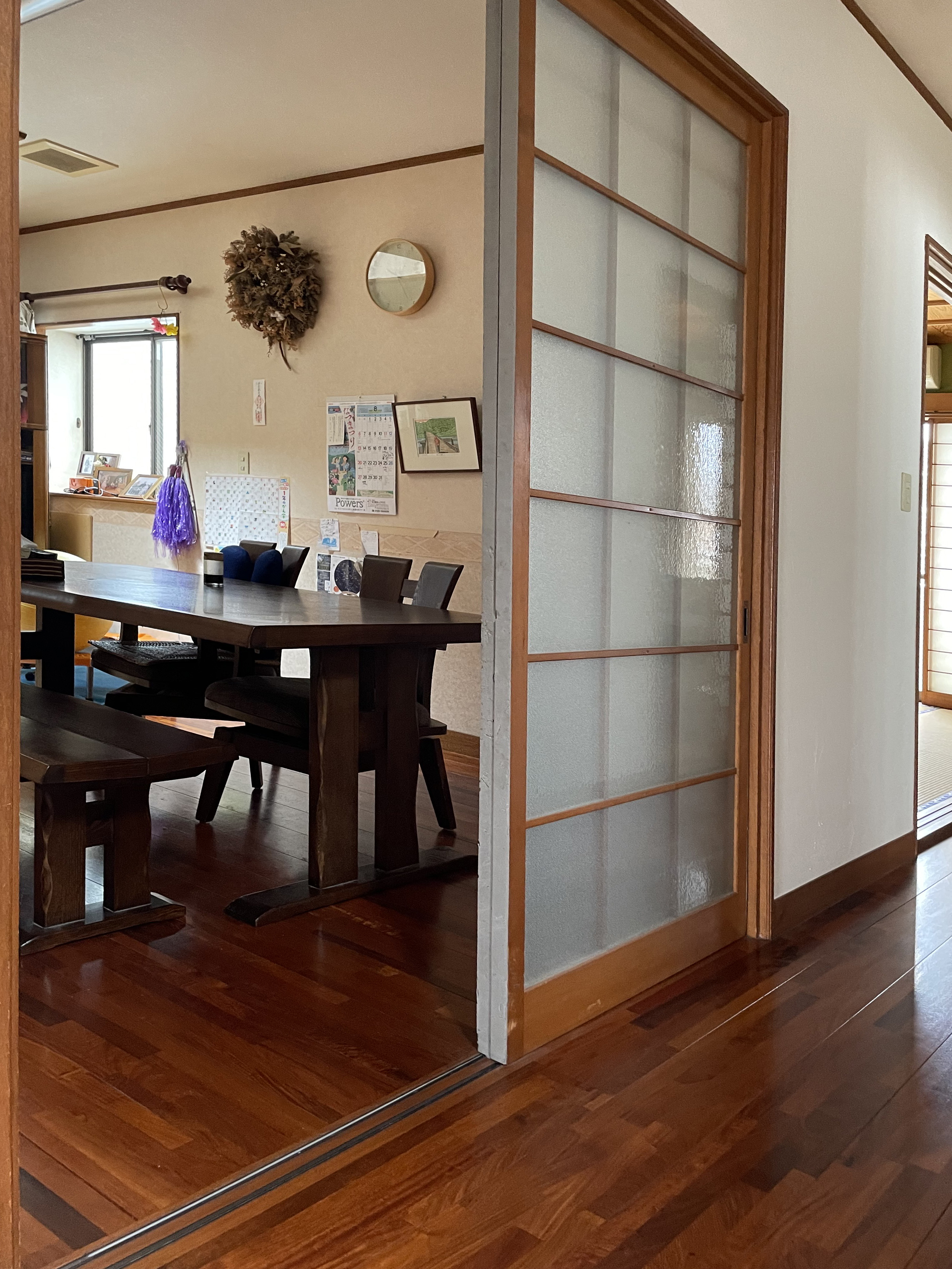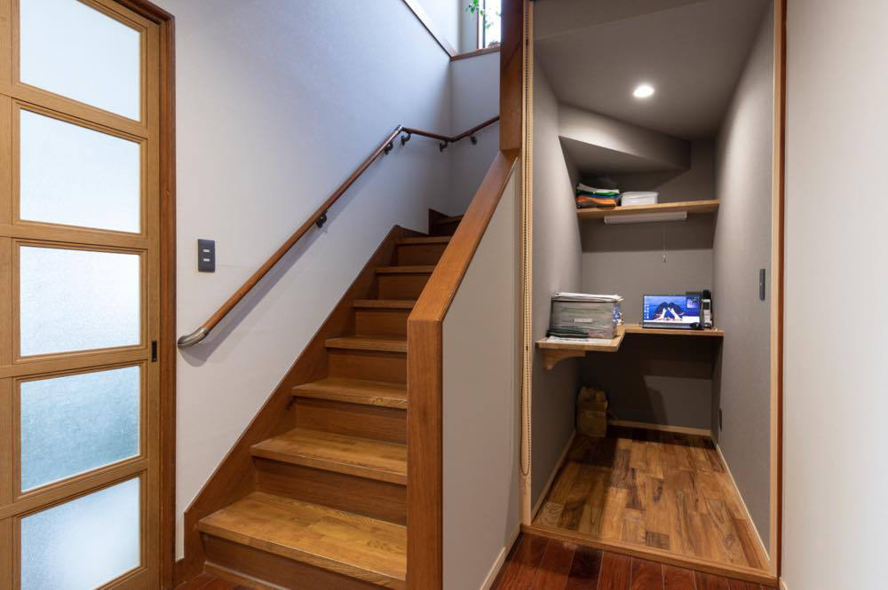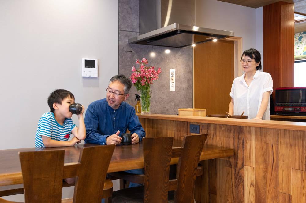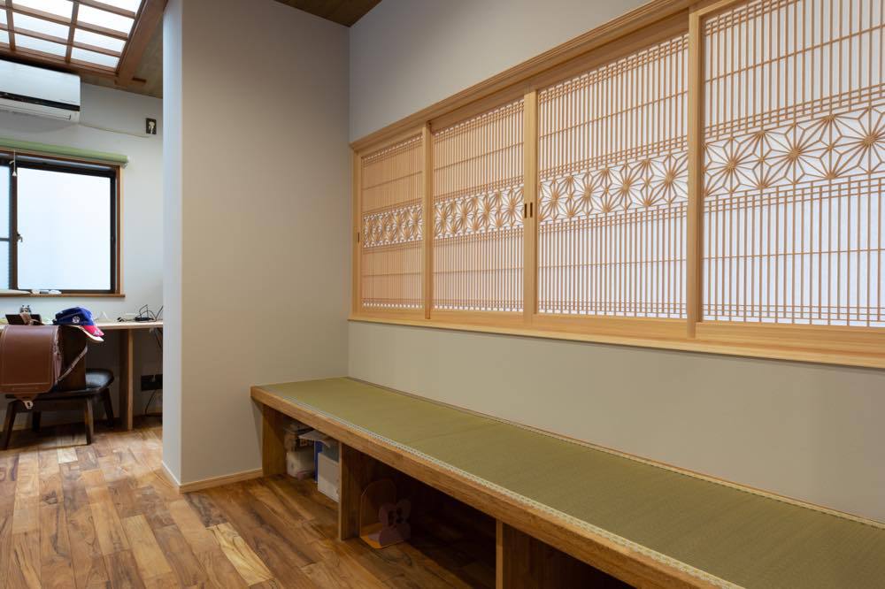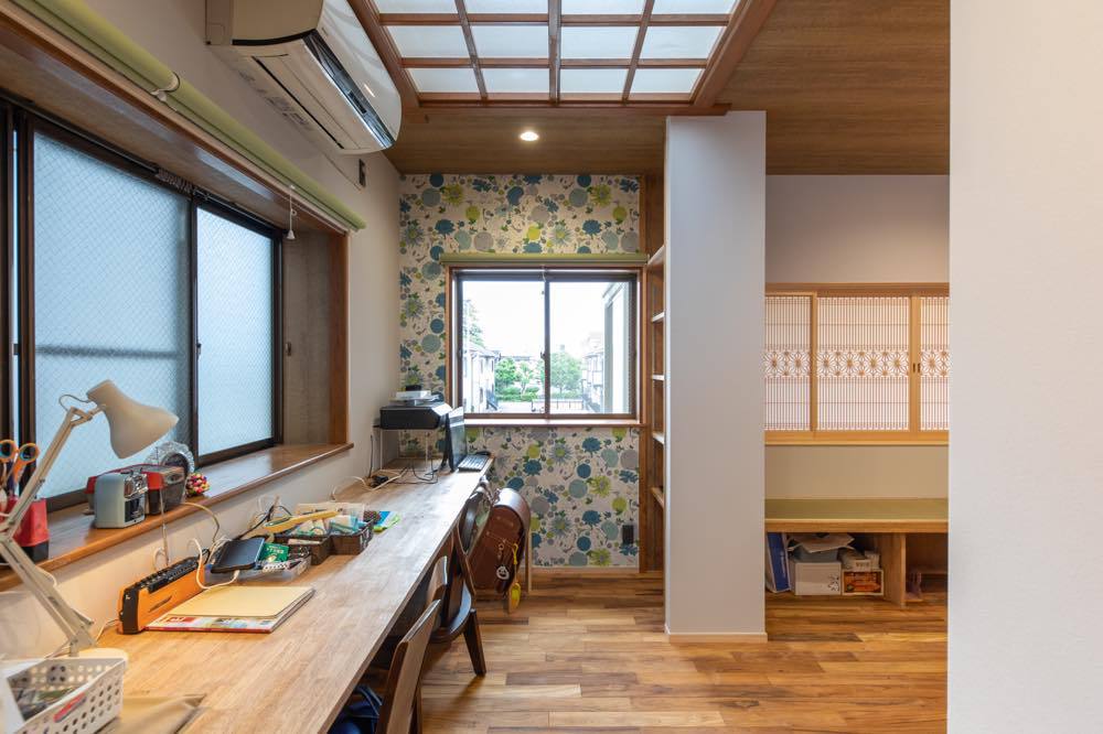 区画整理で25年前に建て替え。その後で南側に3階建ての家が建ち日当たりが悪くなってしまったことと家族構成の変化もあって、リフォームを決断しました。1階にあったキッチンをなくし、リビング・和室とつなげて生まれた15畳の和室は、ご主人が開く運動教室の会場に。浴室は生徒さんの靴箱も備えた玄関に変わりました。店舗と住居が接する廊下の突き当たりには、階段下を活用した書斎コーナーを新設。壁紙を変えて一新した階段を上がると、オープンキッチンを中心に回遊できる、明るく風通しのよい空間が広がります。続きの仏間は和紙畳のリビングと板張りのダイニングに変身。障子窓はそのまま活かし、壁の曲線や矢羽根天井で和洋折衷の仕上がりに。家事室とスタディコーナーは北欧風とデザインにもこだわりました。