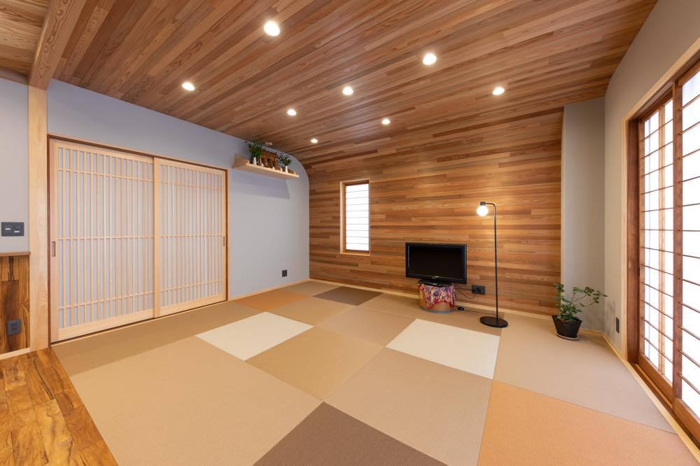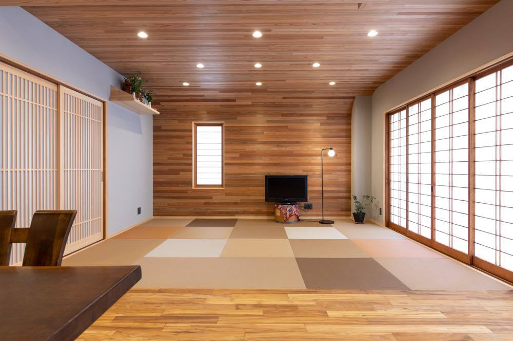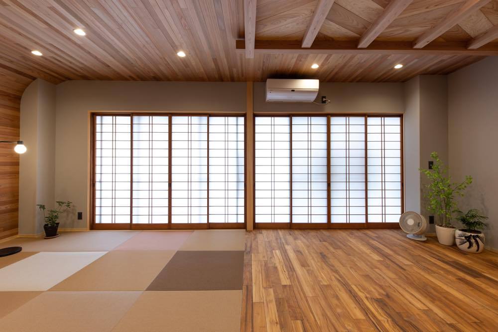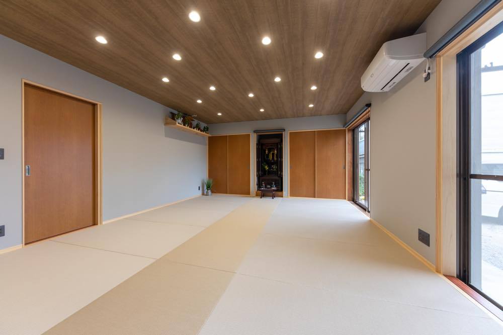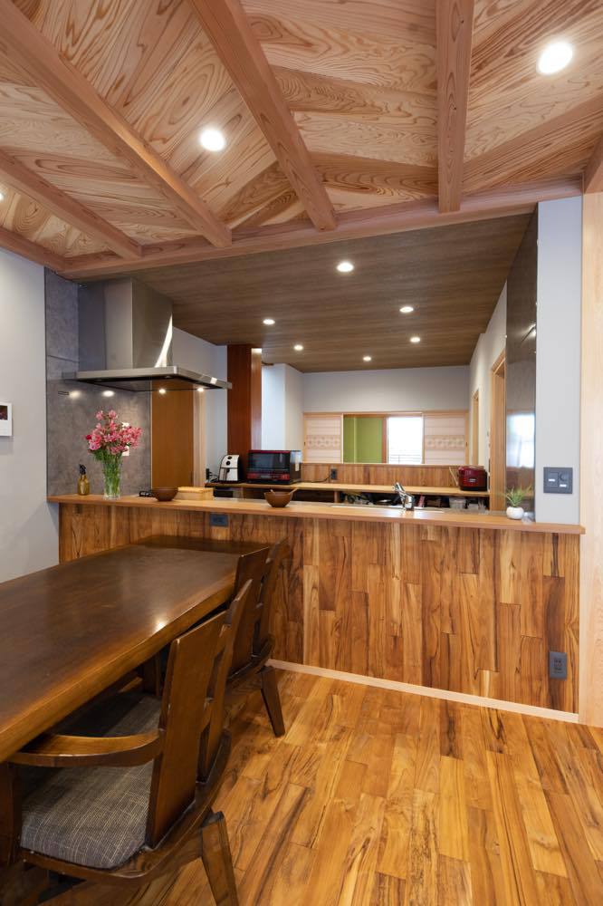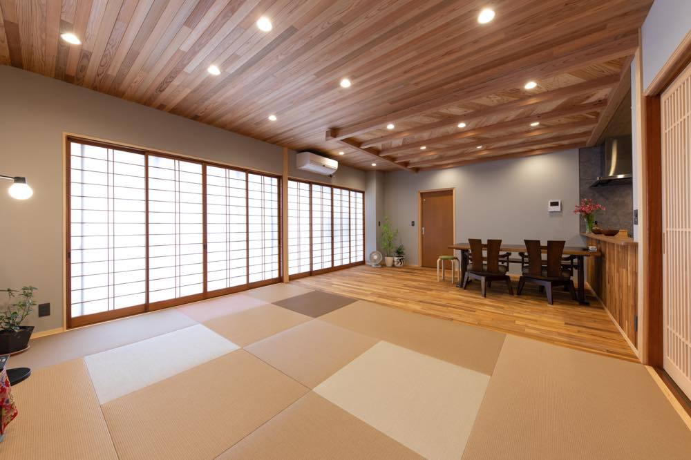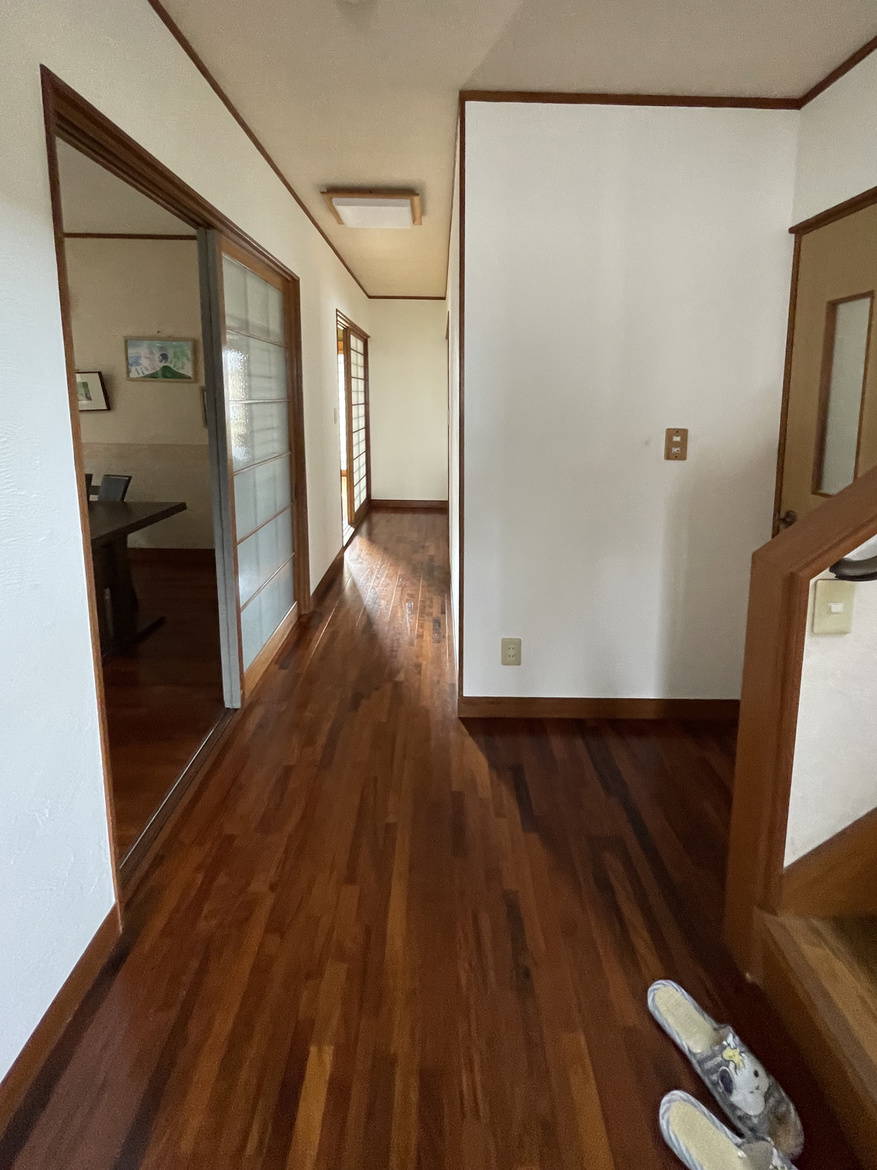 区画整理で25年前に建て替え。その後で南側に3階建ての家が建ち日当たりが悪くなってしまったことと家族構成の変化もあって、リフォームを決断しました。1階にあったキッチンをなくし、リビング・和室とつなげて生まれた15畳の和室は、ご主人が開く運動教室の会場に。浴室は生徒さんの靴箱も備えた玄関に変わりました。店舗と住居が接する廊下の突き当たりには、階段下を活用した書斎コーナーを新設。壁紙を変えて一新した階段を上がると、オープンキッチンを中心に回遊できる、明るく風通しのよい空間が広がります。続きの仏間は和紙畳のリビングと板張りのダイニングに変身。障子窓はそのまま活かし、壁の曲線や矢羽根天井で和洋折衷の仕上がりに。家事室とスタディコーナーは北欧風とデザインにもこだわりました。